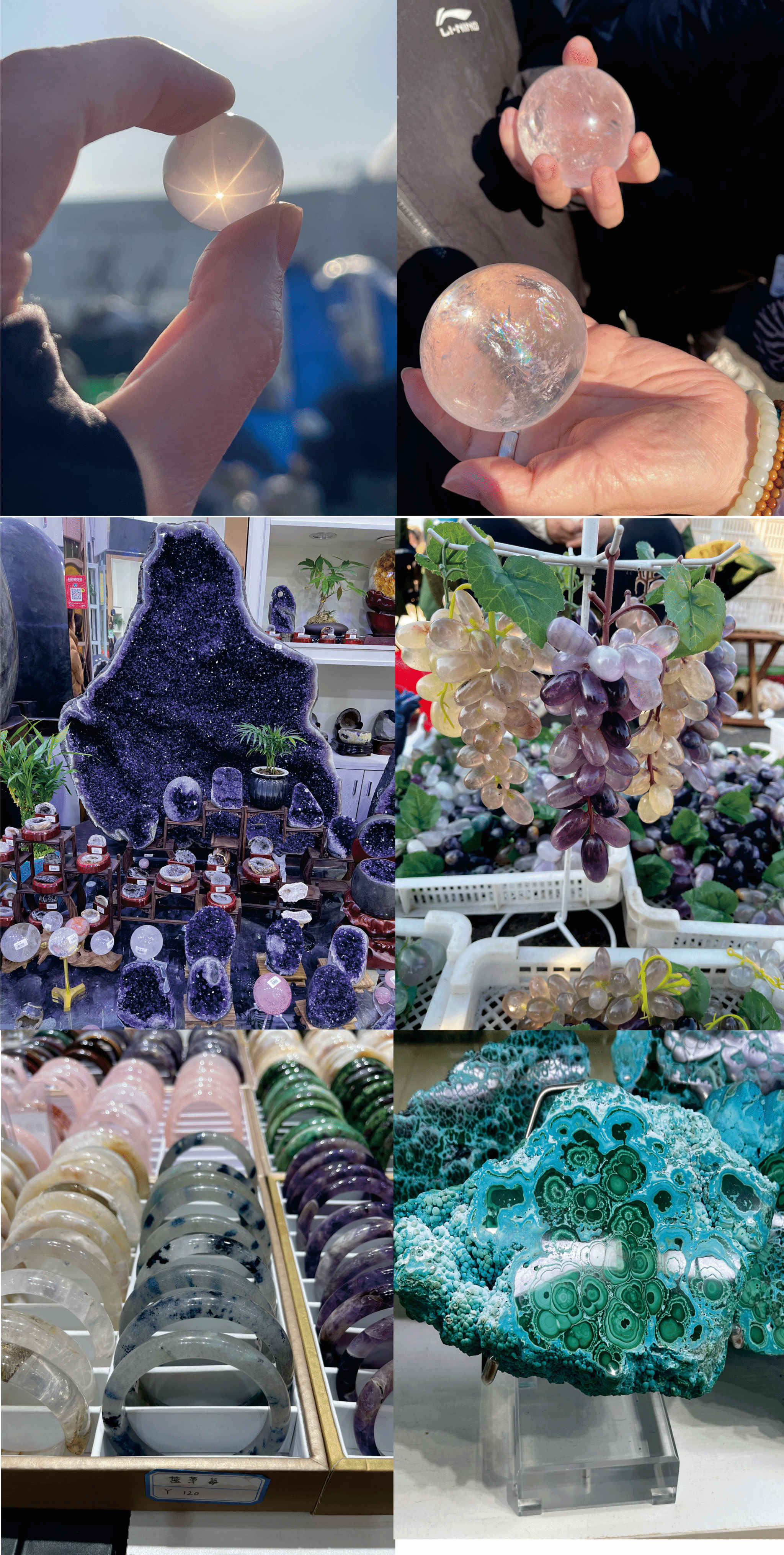 一进入水晶城,同学们就被热闹的交易场景所吸引。原石摊、手串摊、工艺品摊等琳琅满目,红兔毛、绿幽灵、福禄寿等各种水晶品种让人眼花缭乱。同学们分组行动,与商户们进行了深入的交流。他们询问水晶的产地、品质、价格等问题,了解水晶的市场行情和销售渠道。商户们也非常热情,耐心地解答同学们的问题,并分享了自己在水晶经营过程中的经验和故事。有的同学还现场学习了如何挑选水晶原石和成品,如何辨别水晶的优劣和真伪。此外,水晶城的跨境直播也吸引了同学们的目光,他们观看了主播们的直播过程,学习了如何结合水晶和宝石类产品的特点进行线上销售。