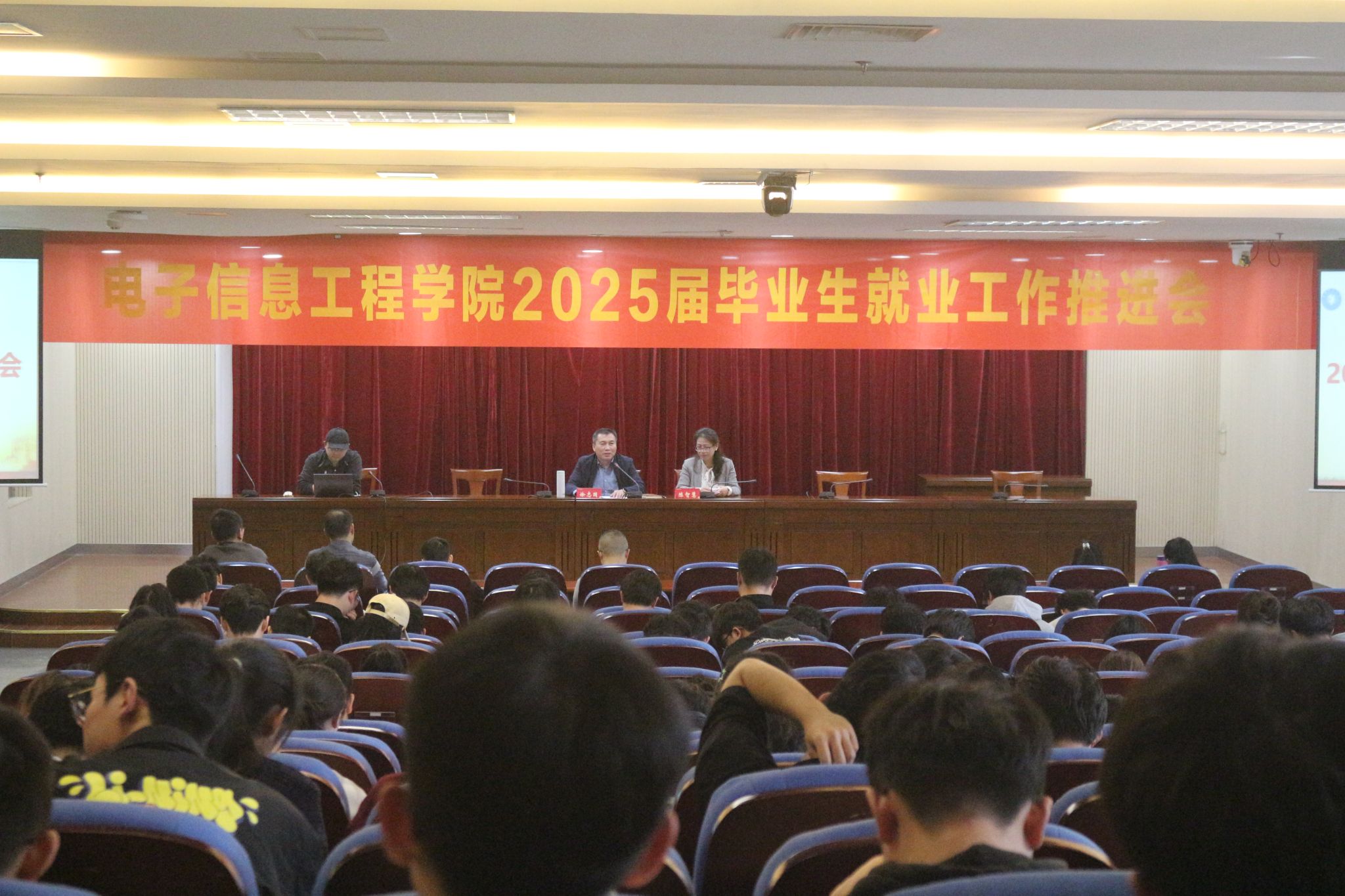 3月25日下午,电子信息工程学院在图书馆第二报告厅召开了2025届毕业生就业工作推进会,学院党委书记徐志国、副书记陈智慧、学工办副主任宋洁明、教务办副主任查慧慧、各系主任、25届毕业班辅导员和班主任及全体毕业生参会,会议由就业干事、辅导员征文维主持。