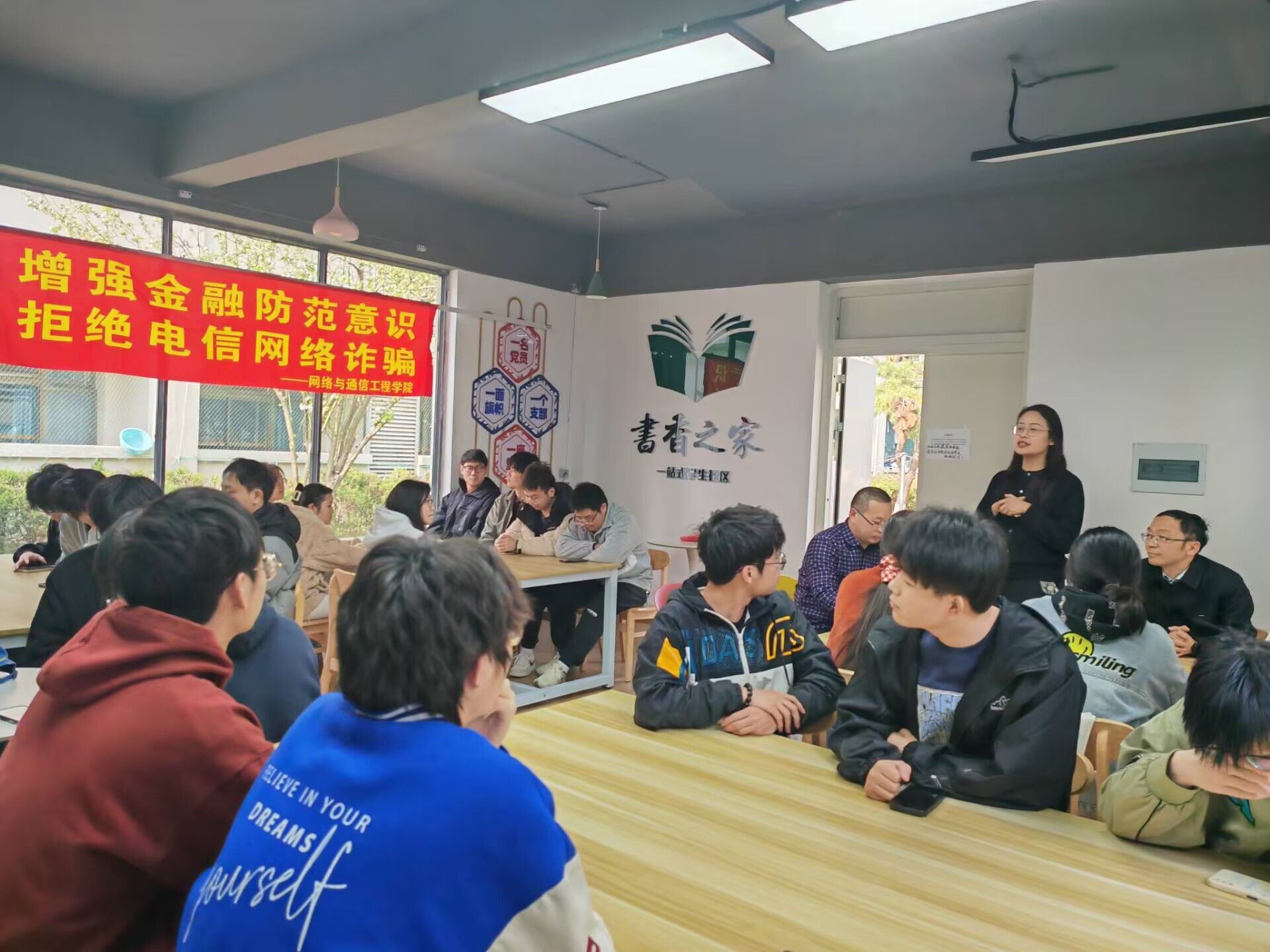 当日下午,网通学院的老师们来到了北区01栋一站式学生社区,为网通学院22级通信工程2班的学生开展了一场主题为“增强金融防范意识 拒绝电信诈骗”的主题班会。会上,网通学院书记沐阳向在场学生介绍了诈骗分子常见的诈骗手法,她提醒大学生们必须提高警惕,增强防范意识,不轻易转账支付;网通学院院长王池社向同学们介绍了通信专业的专业前景,他鼓励同学们充分利用在校时间,抓好人生的转折点。