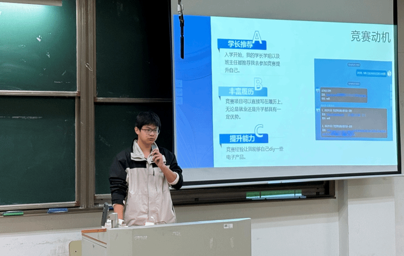 在经验分享环节,三位学生代表以深入浅出的方式解析竞赛要点,通过切身案例展现创新实践的多元价值,通过展示往届优秀团队的技术路线图与成长轨迹,帮助大一同学建立清晰的备赛认知框架。活动最后,黄伟老师对本次交流会进行总结分享,鼓励同学们积极参与,在科创实践中深化学习,收获荣誉与团队友谊。