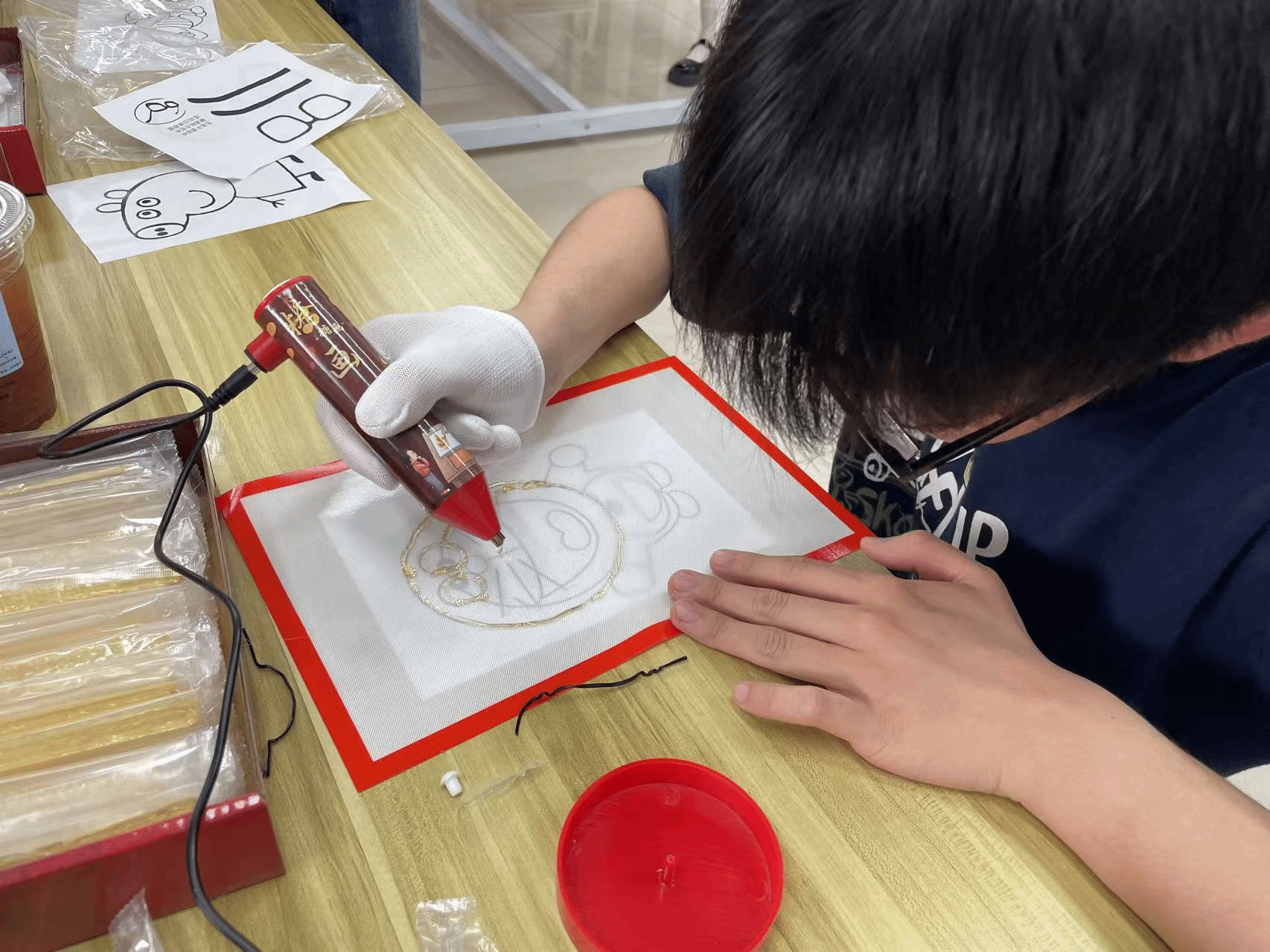 活动伊始,组织部部长魏怡帆同学为在场师生详细讲述了糖画这一国家级非物质文化遗产的历史渊源,从唐代 "糖丞相" 的雏形到明清时期的市井流行,勾勒出千年传承的文化脉络。她还现场展示了糖画制作的全套工具:灵巧的糖画笔、琥珀色的麦芽糖、光洁的亚克力画板,让大家直观感受传统工艺的精巧。随后开始了实践体验环节,师生们纷纷化身为"非遗传承人",手持糖画笔,在温热的画板上展开创意之旅。尽管初次尝试时手法略显生涩,但热情丝毫不减——有的同学专注地勾勒出振翅欲飞的蝴蝶,翅膀上的纹路清晰可见;有的则大胆创新,创作出自行车、眼镜等现代元素与传统工艺结合的独特造型。现场气氛热烈,欢声笑语此起彼伏,在师生的相互交流与协作中,一幅幅充满巧思的糖画作品相继诞生,甜蜜的气息弥漫在整个活动的现场。