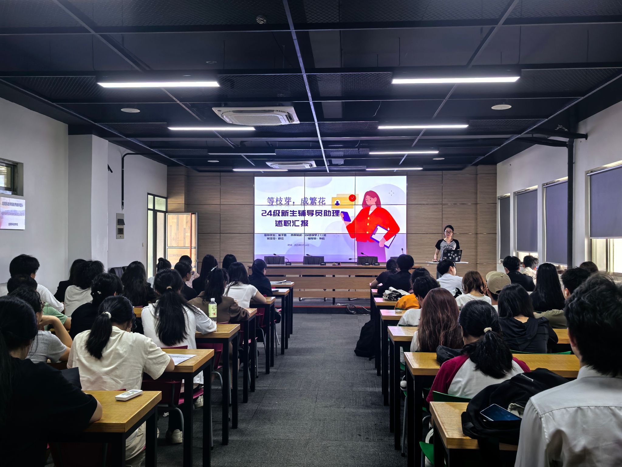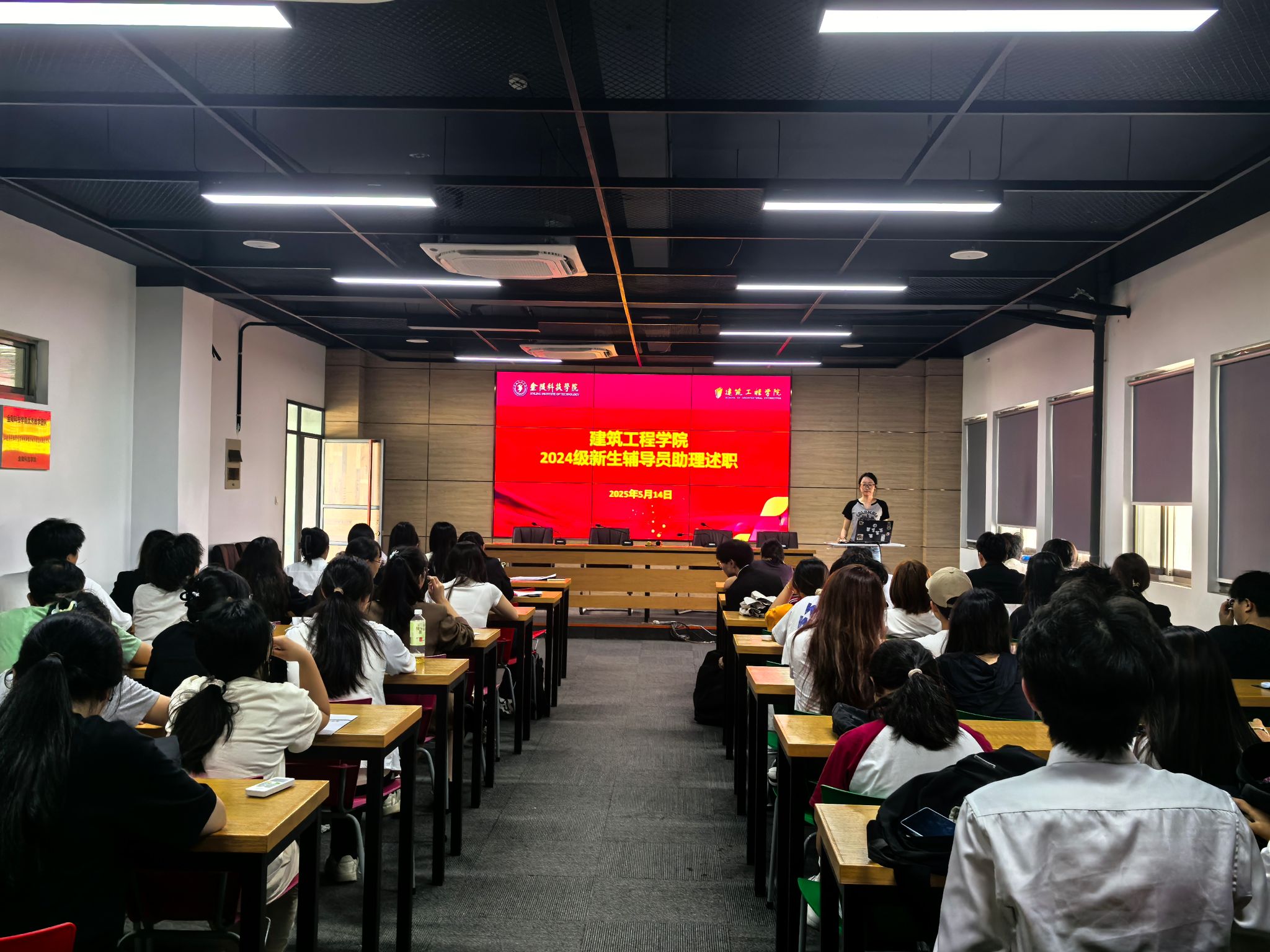 为总结新生入学教育阶段性成果,提升学生骨干队伍能力,深化“朋辈引领”育人实效,5月14日下午,建筑工程学院在工科楼b513举行2024级新生辅导员助理述职会。学院学工办主任鲍飞豹、团总支书记、学工办副主任鲁瑶、24级新生辅导员李俊儒、孙宏参会、2024级新生班级助理及学生代表共100余人参加会议。