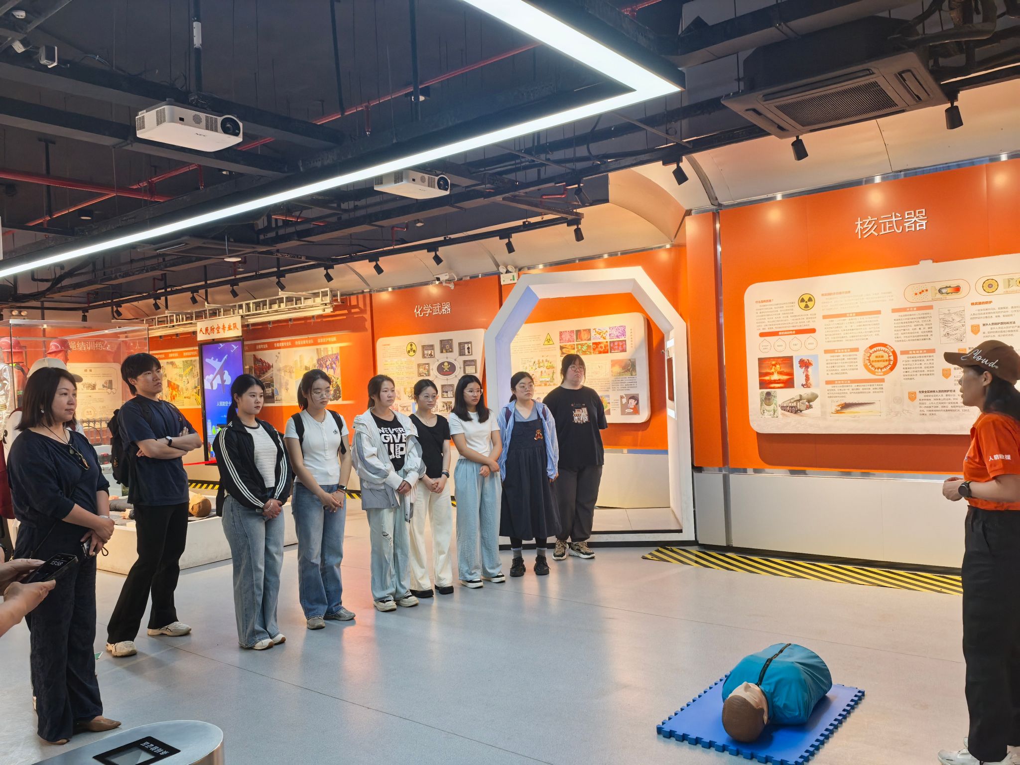 在长江路人民防空教育体验馆,退伍干部张德根结合自身丰富的国防安全专业知识和工作经验,为师生们进行了深刻而生动的南京防空历史与现状专题讲解。他通过详实的介绍和沉浸式的场景模拟,将南京这座城市的防空脉络清晰呈现。让书本上的国防知识变得立体可感。此外,玄武区国动办的专业急救技能培训师现场为师生们开展心肺复苏技能操作演示,在专业人员的指导下,师生们认真学习、积极实操,掌握了在紧急情况下挽救生命的宝贵技能,深刻理解了“人民防空为人民”的内涵。