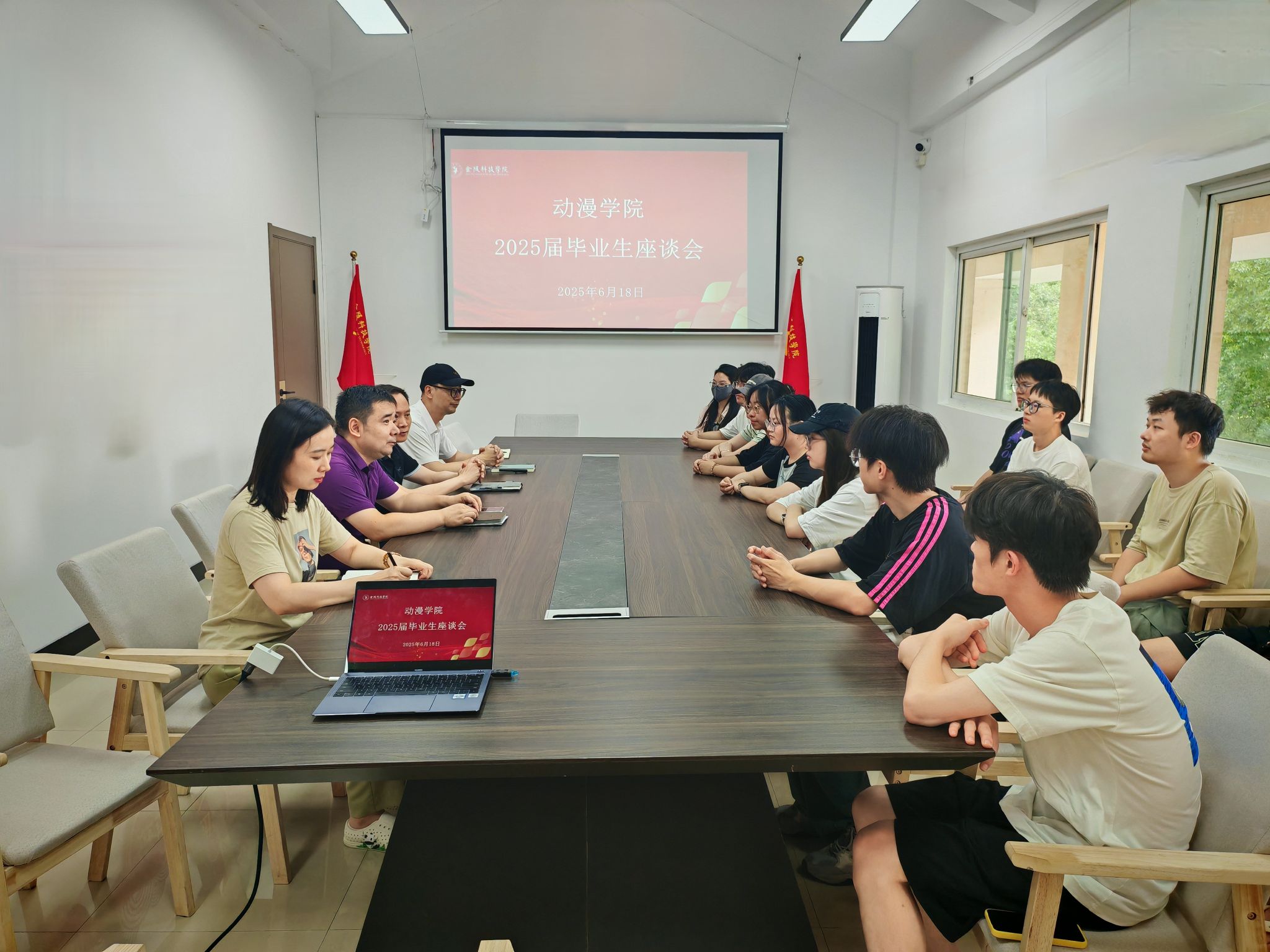 近日,动漫学院在南区02栋“一站式”学生社区举行2025届毕业生座谈会。学院党总支书记葛维东、院长王贤波、副院长王柯及辅导员代表齐聚一堂,与2025届毕业生代表深入交流,倾听他们在校四年的成长感悟与未来规划。
