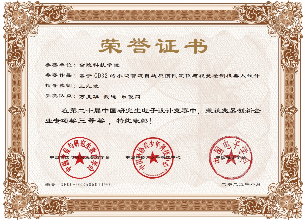 总决赛现场,团队成员万兆华、武迪与清华大学、北京大学、电子科技大学、东南大学等顶尖高校研究生同台竞技。管道机器人项目聚焦小型管网维护难题,基于GD32集成多传感器融合EKF定位与改进YOLOv5视觉检测算法,采用多节串联式轮式机构,实现复杂管道内厘米级定位与毫米级缺陷智能识别。作品均以“真问题、真需求、真落地”为导向,赢得评审专家与企业代表一致好评。