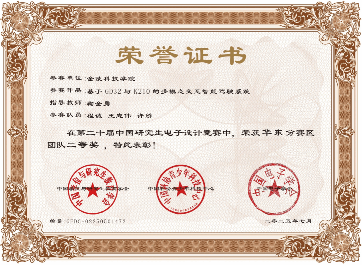 机电工程学院AI生活“创客”班(凌云科创团队)的两支研究生队伍,在333所高校、8241支初赛队伍、635支总决赛队伍的激烈角逐中脱颖而出:由王志凌老师指导,万兆华、武迪、朱俊同学完成的作品《小型管道自适应惯性定位与视觉检测机器人》先夺华东赛区一等奖,再获全国总决赛“兆易创新企业专项赛”三等奖;由鞠全勇老师指导,程诚、王志伟、许娇同学研发的《基于GD32与K210的多模态交互智能驾驶系统》则斩获华东赛区二等奖。至此,球王会首次实现该赛事奖项零的突破!