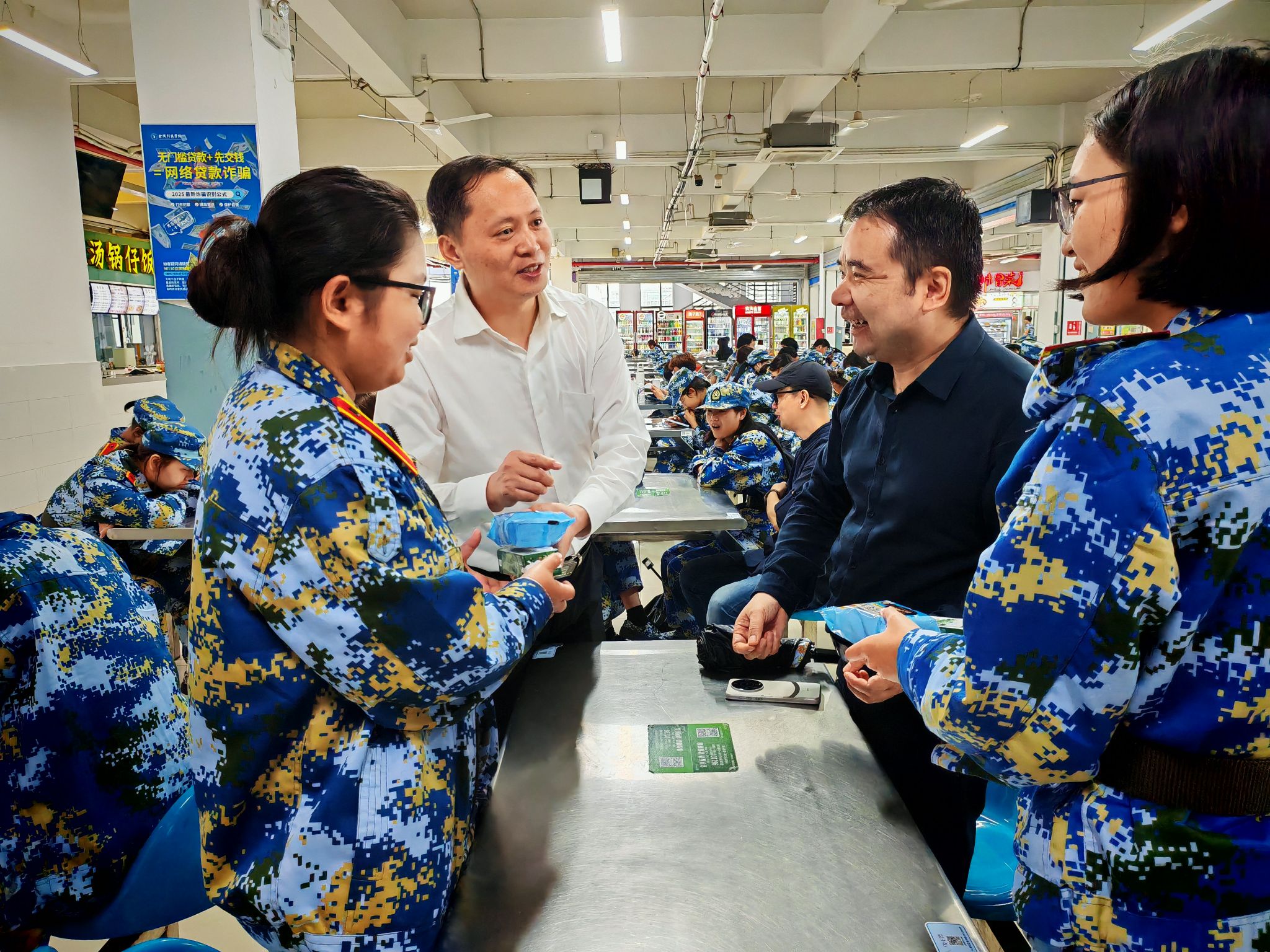 9月25日下午,秋雨绵绵,动漫学院精心组织了一场温馨的新生军训慰问活动。学院党总支部书记葛维东、院长王贤波、副院长王柯、全体辅导员及新生辅导员助理一行,专程前往南区食堂,看望慰问因大雨暂时调整训练计划、在此休整的2025级参训新生,为他们送去学院的深切关怀和殷切鼓励。