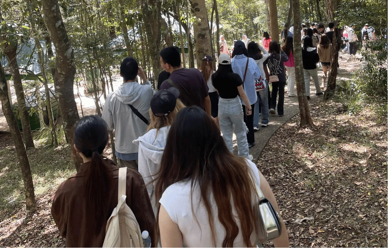 随后,队伍开赴附近的原始森林步道,开启了一段充满负氧离子的徒步之旅。校友们三五成群,漫步于林荫小道,畅谈着从母校毕业后的发展近况与在澳洲的生活点滴。茂密的桉树林见证了校友间深厚的情谊,潺潺的溪流声与鸟鸣声仿佛为这场难得的相聚伴奏。徒步不仅锻炼了身体,更让大家在自然的静谧中放松了身心,加深了彼此的了解。