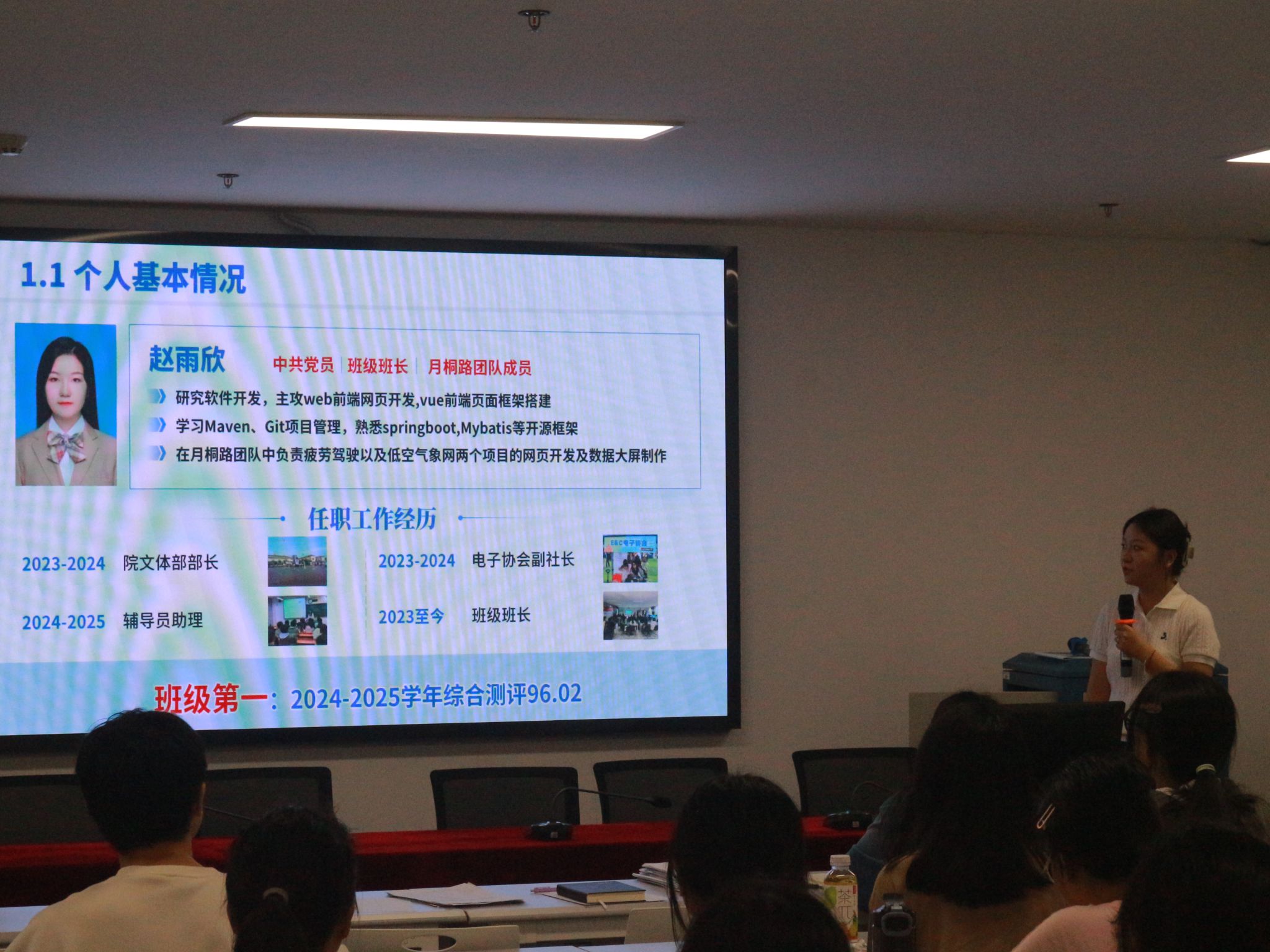 答辩现场,各位申请学生依次登台,以PPT为媒介,从个人思想道德建设、学业成绩、学生工作履历、学科竞赛成果、社会实践贡献以及校园文化活动参与等维度展开全方位自我展示,生动阐述大学期间的成长轨迹与收获成果。他们中,有人在专业学习上始终名列前茅,有人在科研创新领域屡获突破,有人在志愿服务中践行责任担当,每一份答卷都彰显着电信学子的卓越风采。