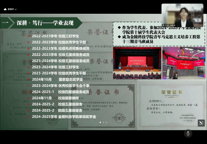 本次评审答辩严格恪守“公平、公正、公开”准则,经个人申报、资格初审等前置环节后,共有12名学生脱颖而出进入答辩环节。会上,徐泰龙、葛一鸣、马俊驰、杨洋、赵允嘉、秦梦瑶、李文权、朱亚琪、刘亦冉、李文杰、于佩仪、成俊云12位候选人依次进行申报陈述。通过PPT演示,候选人围绕个人核心优势,从学业成绩、科研探索、学科竞赛、学生工作、文体实践、社会服务等维度展开全面汇报。他们的展示不仅集中呈现了过往学年的亮眼成果,更生动诠释了我院学子锐意进取、笃行不怠的青春风貌。答辩结束后,学院国奖评审小组通过小程序进行公开打分与综合评议,最终确定国家奖学金推荐人选。
