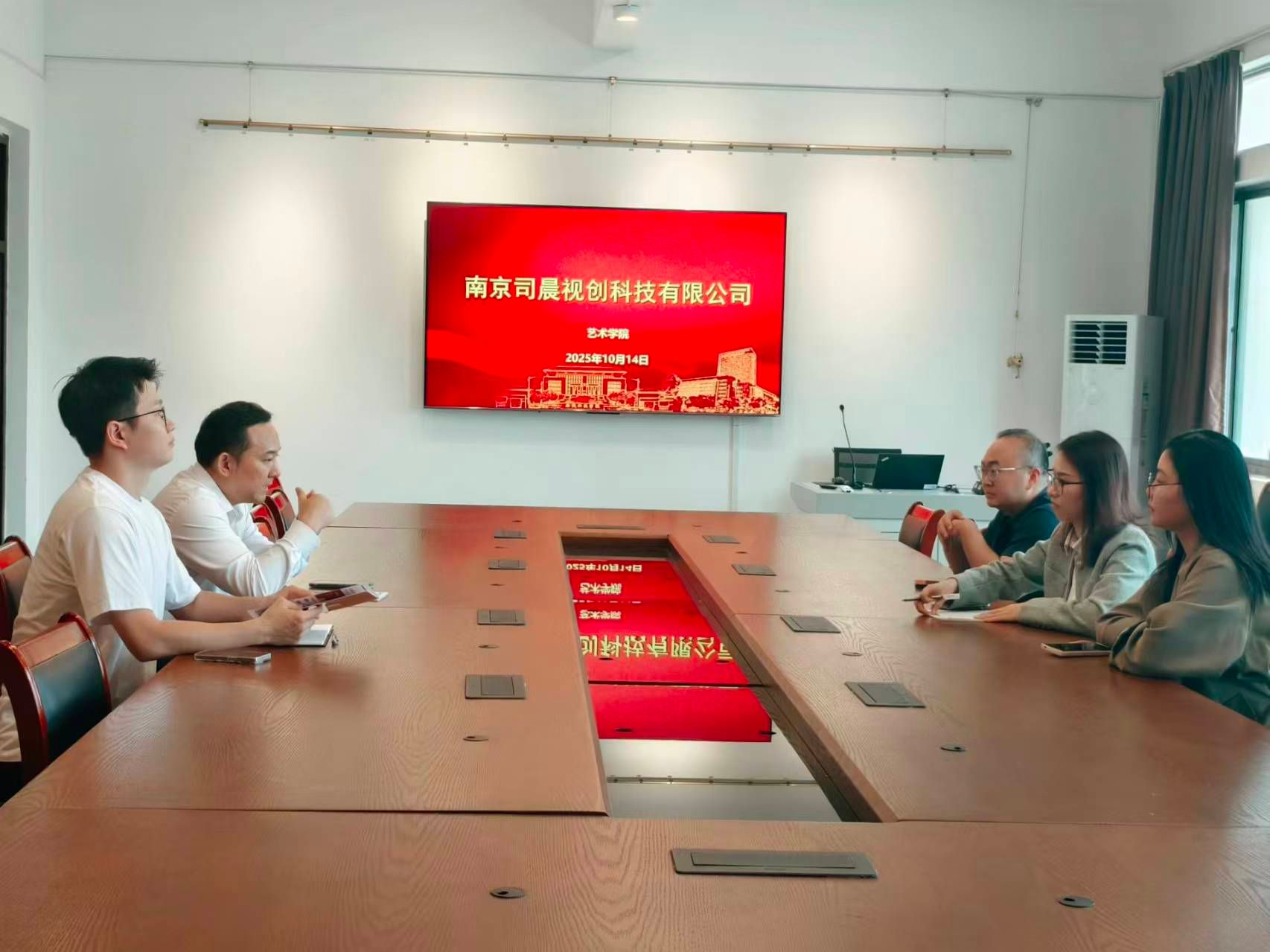 活动伊始,艺术学院党委副书记鲍锐、产品系副主任樊文育与南京司晨视创科技有限公司总经理徐建喜围绕人才培养与就业合作展开深度洽谈。鲍锐副书记详细介绍了学院在艺术设计领域的办学特色、专业优势,以及2026届环艺系、产品系毕业生的技能特长与就业意向;徐建喜总经理则结合行业发展趋势,全面阐述了公司在视觉创意等领域的业务布局,以及岗位需求数量、核心能力要求与人才发展路径。双方最终达成共识,明确以“优化课程体系、强化实践环节”为核心目标,推动人才培养与企业需求无缝衔接,提升学生就业竞争力。