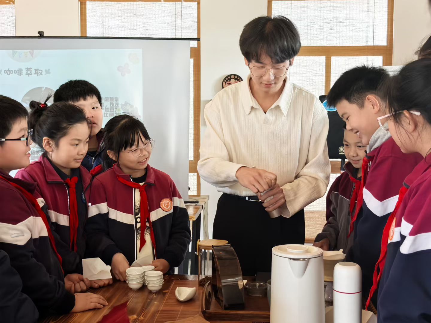 传统文化如何与现代生活碰撞创新火花?10月22日,园艺园林学院联合南京晓庄实验学校小学部(晓庄校区)的“行知茶语”茶文化社团,以系列课程第三讲“茶咖跨界融合”特色课作答。课程延续 “大手拉小手”模式,按“理论讲解—实践操作—创意发散”递进设计,带领学子在茶香与咖香中探索文化融合之美。