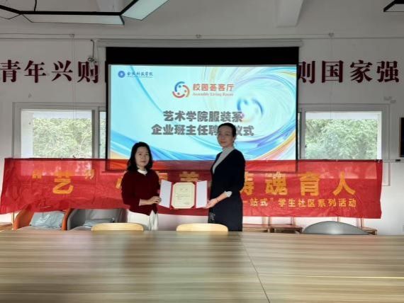 仪式尾声,艺术学院服装系系主任张海晨老师为叶明女士颁发企业班主任聘书。这既是对其专业成就的认可,也是校企协同育人的重要实践。未来,叶明女士将通过课程指导、项目合作等形式,助力服装系学子拓展行业视野、提升实践能力。