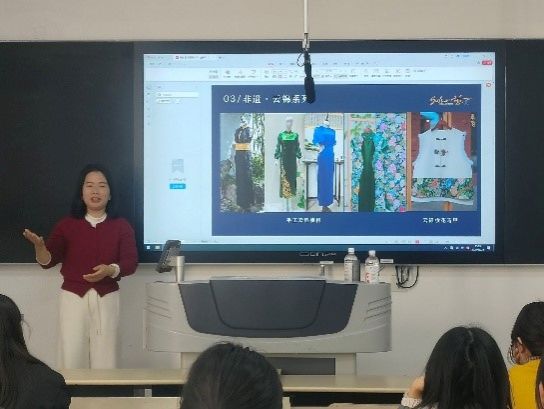 在分享环节,叶明女士以“面料与旗袍设计的对话”为主线,阐释非遗面料的历史脉络与当代价值。她以南京云锦、苏州宋锦、正娟、香云纱为例,剖析其工艺特性与文化寓意:南京云锦“寸锦寸金”,适用于中高端定制礼服;苏州宋锦质地坚韧,几何纹样兼具实用与审美价值……她通过视频与图文强调非遗面料在旗袍设计中的重要性,现场氛围专注热烈。