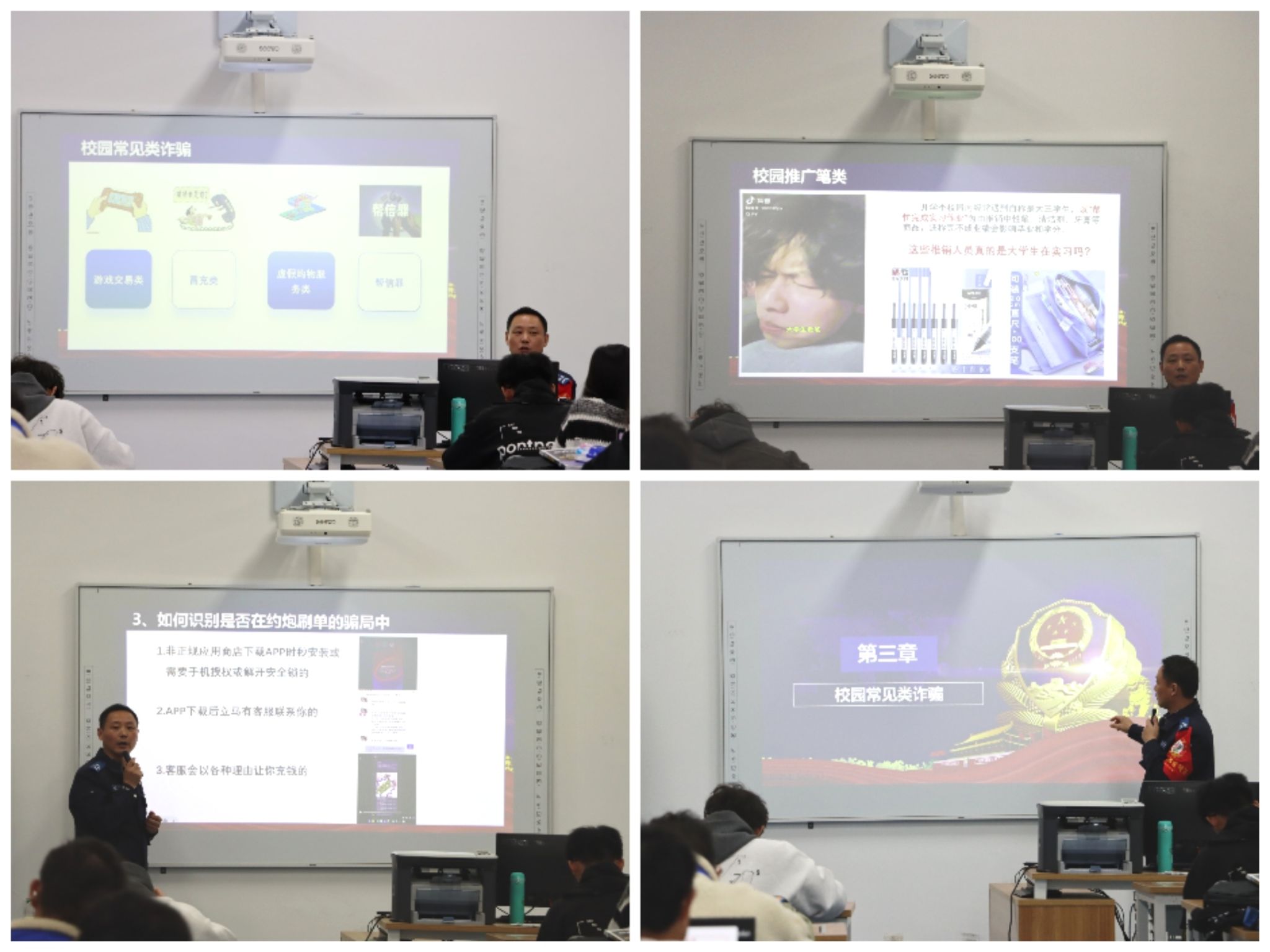 同学们依照警官指示将“特别提醒+八个凡是”转发至班级群、家庭群和朋友圈,旨在随时警示自己及身边人勿听勿信,以防被骗,争做防诈工作的坚定宣传者。随后,警官从网络交友、游戏买卖和约炮交易等诈骗套路入手,结合具体案例,“多方面,多层次,全综合”为大家仔细甄别诈骗套路,不断强化在座同学的安全防范意识。讲座让同学们防诈意识的壁垒再次筑牢,让安全防线再次加固。