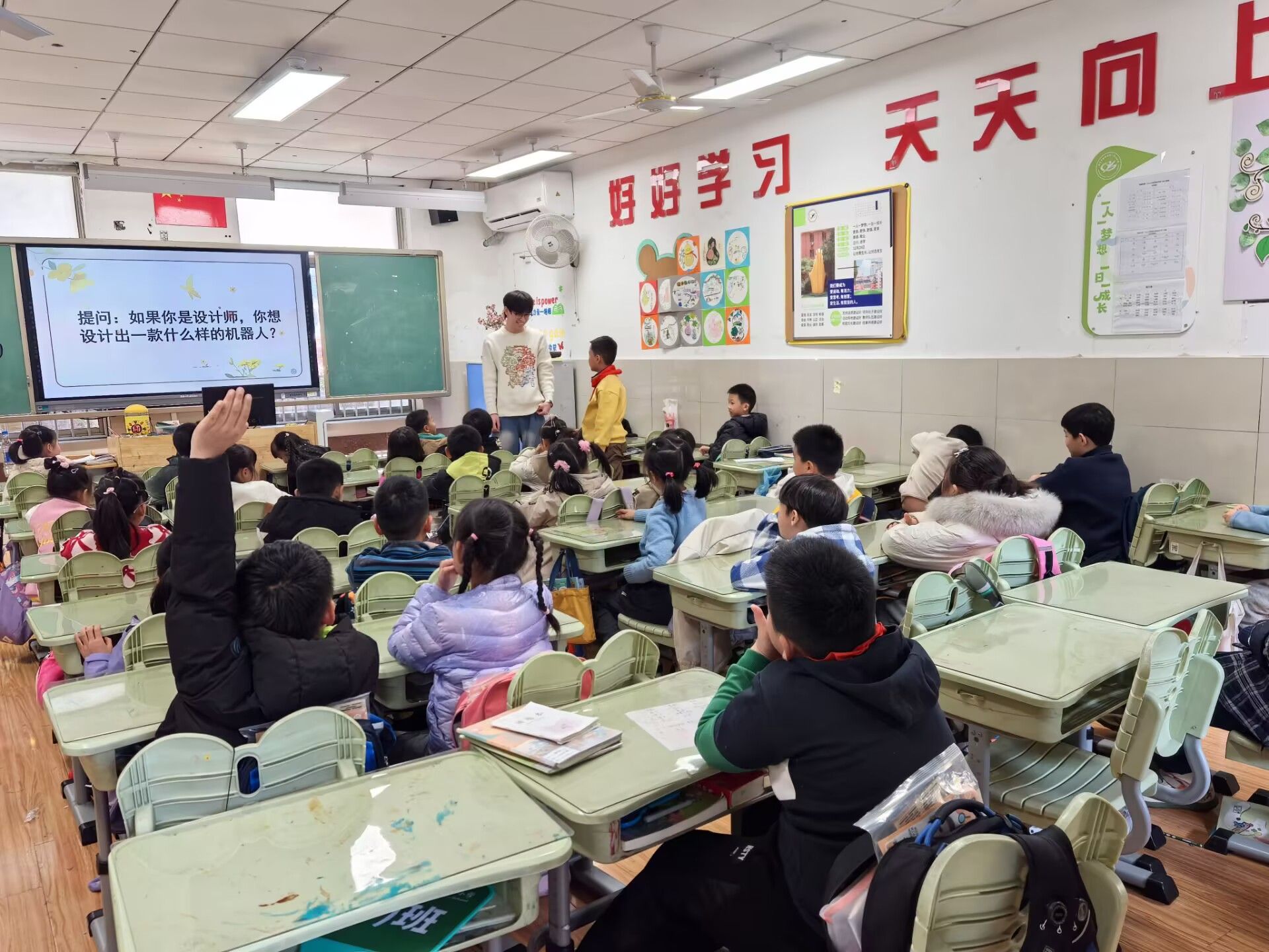 高校智慧“零距离”,王赛雨以生动讲解开启科技之旅,巧用马达小船、球形齿轮、机械臂、篮球机器人等趣味科技模型导入主题,用直观可见的动态演示拆解机械原理,将抽象科技知识转化为鲜活场景,快速吸引学生注意力,激发探索兴趣。随后,消防巡检机器人、竞速机器人、智能侦察机器人车依次亮相,通过模拟实操、互动体验展现科技魅力,团队成员精心指导学生调试指令、操作运行,在沉浸式体验中传递科创理念。现场学生踊跃提问、积极参与,在欢声笑语中触摸科技、萌发创新意识。我院“行走的科创课堂”将前沿科技转化为孩子们看得见、摸得着的互动体验,架起课本知识与现实应用的桥梁,让科学思维的种子在孩子们心中“生根发芽”。