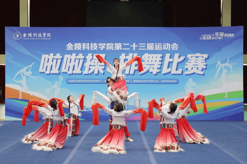 本次比赛商学院共派出16名啦啦操队员和10名排舞队员,他们身着统一服装,精神抖擞登场。伴随着激昂的音乐,啦啦操队员们动作整齐划一、舒展有力,跳跃、旋转、托举等技巧动作衔接流畅,既展现了啦啦操运动的活力与舞蹈动作的美感,又彰显了团队协作的凝聚力。随后,伴随着悠扬而渐强的藏族弦乐与鼓点,排舞队员们以“甩袖”动作起步,他们的长袖如云浪翻涌,身体随音乐起伏,仿佛风吹过高原草甸。在音乐高潮处,队形快速变换,穿插、聚合、散开,如哈达在空中交织飞舞。
