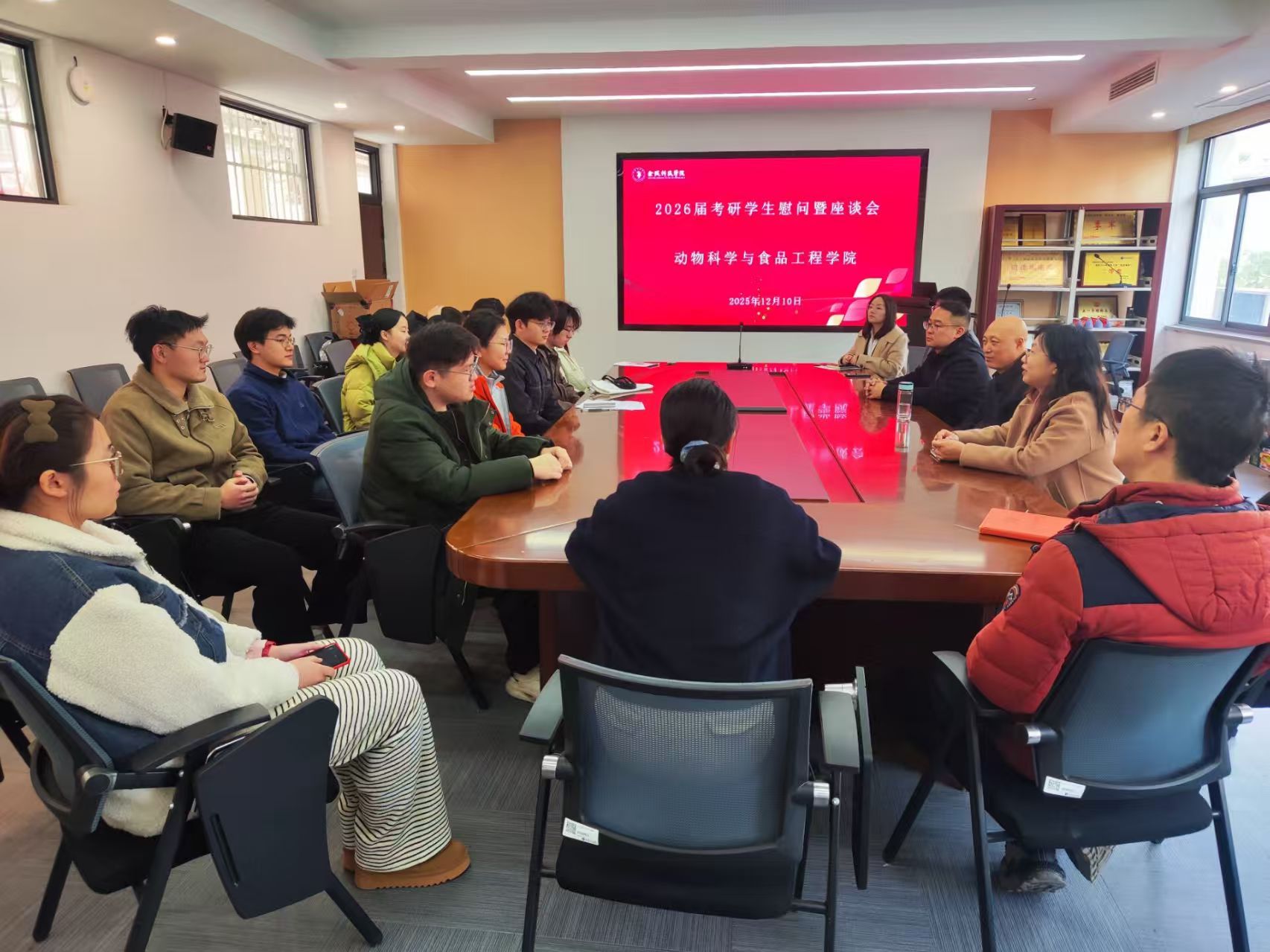 为鼓舞士气,坚定考研学生备考信心,传递学院关怀,12月10日,球王会动物科学与食品工程学院开展2026届考研学生慰问暨座谈交流会。学院党委书记王正昱、党委副书记黄淑婧,系主任、班主任代表及毕业班辅导员出席活动,与考研学子面对面交流。