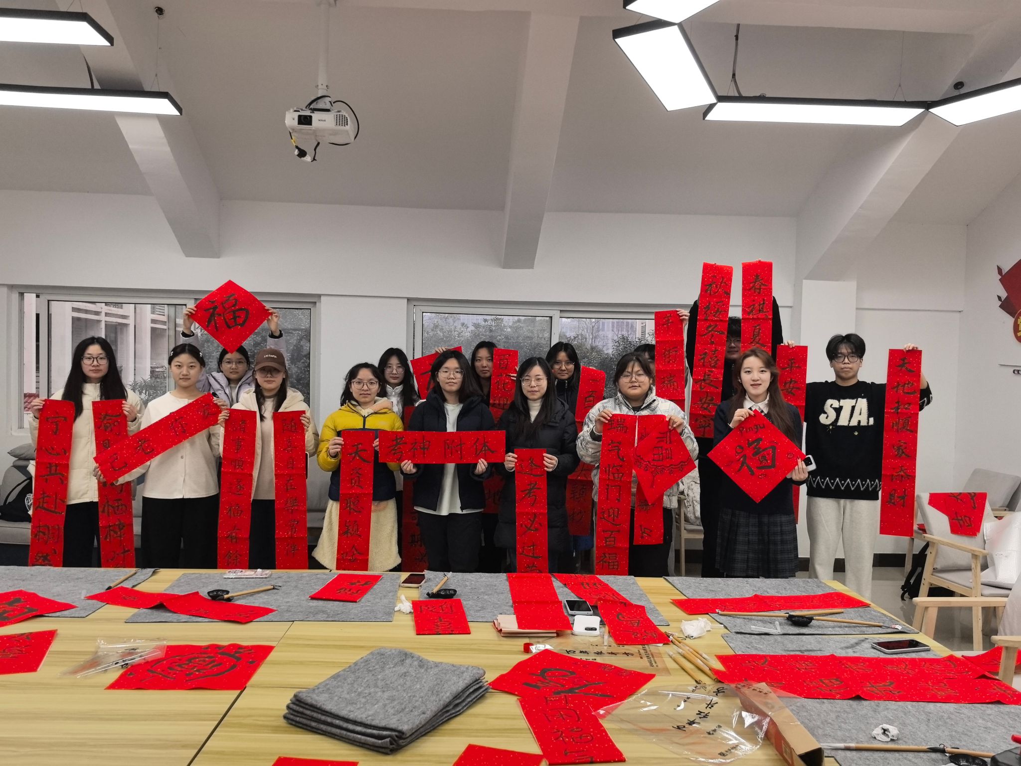 此次活动将传统文化与社区育人相结合,是学院推进“五育并举”、加强人文关怀的切实举措,不仅增强了同学们对学院的归属感和宿舍的凝聚力,更在墨香中疏导了焦虑情绪,激励同学们以更加积极平和的心态迎接挑战。活动结束后,同学们纷纷将书写的春联和“福”字点缀于宿舍门前,为冬日校园增添一抹温暖的亮色。