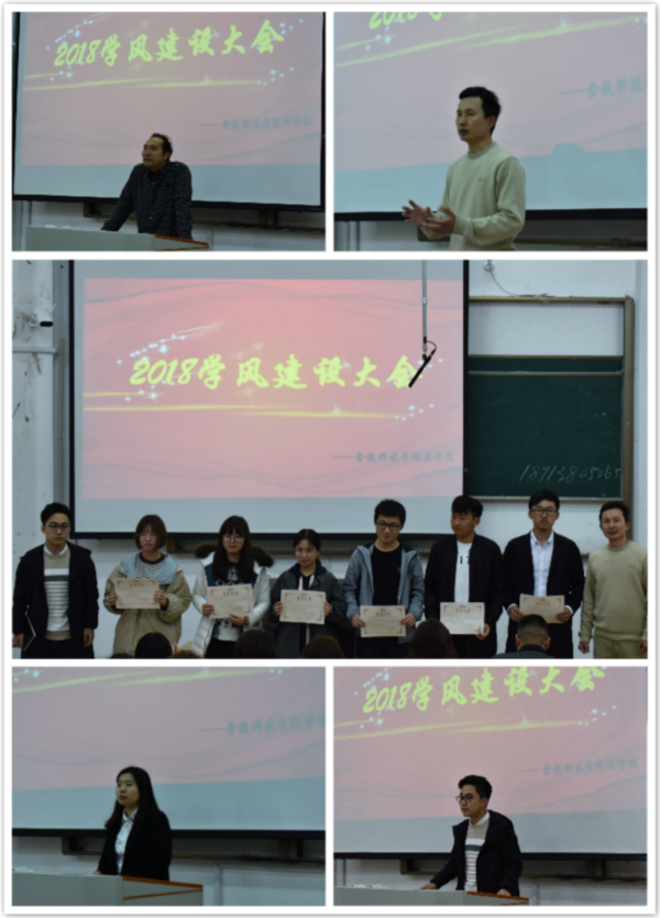 会上,陶应虎副院长指出班风、考风是学风建设重要组成部分,各班班委应与班主任和辅导员保持密切沟通与联系,应引导同学们端正态度、明确目标、做好学业生涯规划,如实填写课堂教学日志,树立优秀榜样,加强班级内部宣传、教育与管理,共同为学院建设而努力奋斗。黄丹丽老师对上学期全院期末考试情况进行了总结,并督促不及格率较高的班级加强学风建设。朱兆海同学总结了17级各班级上学期晚自习整体表现和评优情况,17会计学3班获一等奖,17国际经贸2班获二等奖,17审计学班、17电子商务班获三等奖,17会计学2班、17市场营销1班获优秀奖,在场老师们为以上班级颁奖。在舍风建设方面,徐冰洁老师指出了现阶段宿舍管理与安全方面的问题和隐患,并要求各班针对各项问题进行自查自评。最后,朱骅副书记指出,今年是学校“迎评提升”年,校院发展形势对学风建设提出了新的要求,而学风与考风、班风、舍风密切相关,各团支部、班级应积极梳理问题、研究落实方案,切实加强班集体建设和宿舍建设,共同营造维护优良风气氛围,新学期突显新气象。