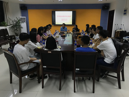 9月21日晚,在中秋、国庆节来临前夕,商学院在科技楼3号楼409会议室举办中秋国庆留校学生慰问座谈会。商学院党总支副书记(主持工作)陆国晓、副书记朱骅,团总支副书记、学工办副主任彭小智,院学生会秘书部部长曹玉洁向留校学生代表送上节日问候。