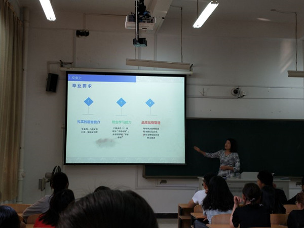 接着,外国语学院教研室主任李凤老师用全英文给同学们带来了一堂专业认知教育课。在李凤老师流利而清晰易懂的发音中,同学们了解到学习本专业所必备的基本素养,以及日后需要提升的能力,同时李凤老师还向同学们介绍了外语专业未来的就业方向,让同学们提前了解就业岗位和环境,让同学们的目标和方向更加清晰。除了专业内容的介绍,李老师还就日常生活方面给了新同学们一些意见,比如如何处理宿舍关系,如何在情感上学会独立等等。