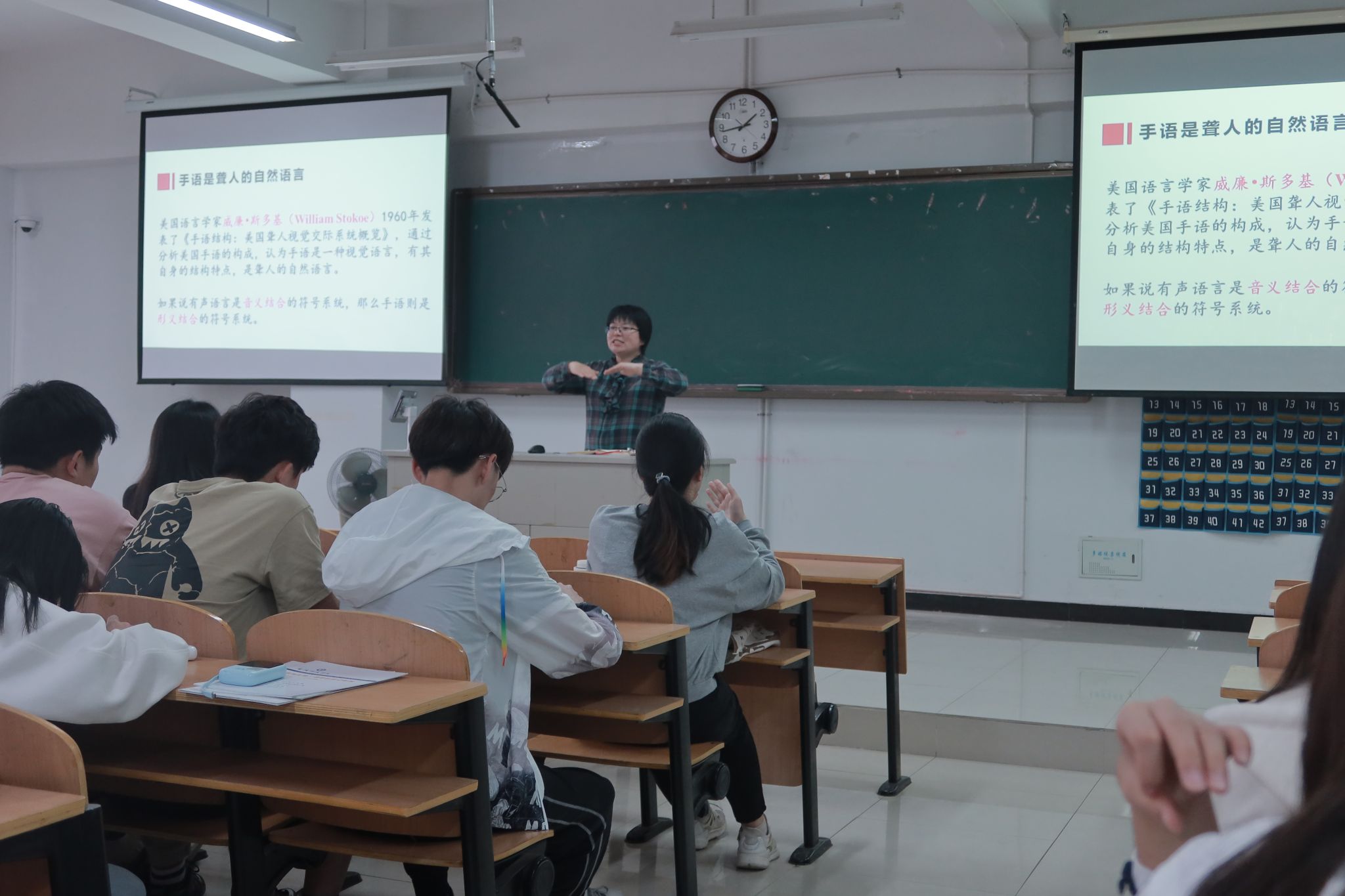 衣玉敏副教授则从何为手语、手语的国别、方言和规范、手语与汉语的关系以及手语学习与翻译等方面入手,通过风趣幽默,详实仔细地讲解,带领同学们走进了手语的世界。衣老师鼓励同学们积极主动帮助听障人士,奉献爱心。