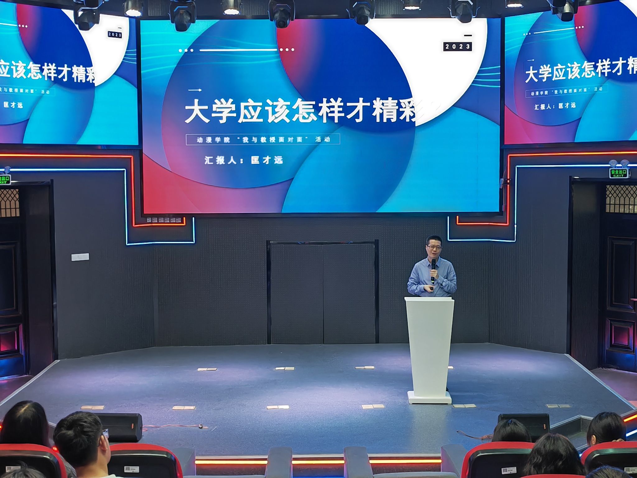 匡才远教授以“大学应该怎样才精彩?”为主题,由自身的学习经历讲起,通过大量具体生动的案例,和同学们一起讨论了理想、学业、生活、责任等四方面内容。活动中,匡教授不时与台下同学交流讨论,现场氛围热烈。他表示,国家是每个人最坚强的后盾,国家强盛个人才有成就,作为新时代大学生应该涵养家国情怀,为中华民族的伟大复兴贡献出自己的力量。希望同学们谨记习近平总书记的嘱托,坚定不移听党话、跟党走,怀抱梦想又脚踏实地,敢想敢为又善作善成,立志做有理想、敢担当、能吃苦、肯奋斗的新时代好青年,让青春在全面建设社会主义现代化国家的火热实践中绽放绚丽之花。