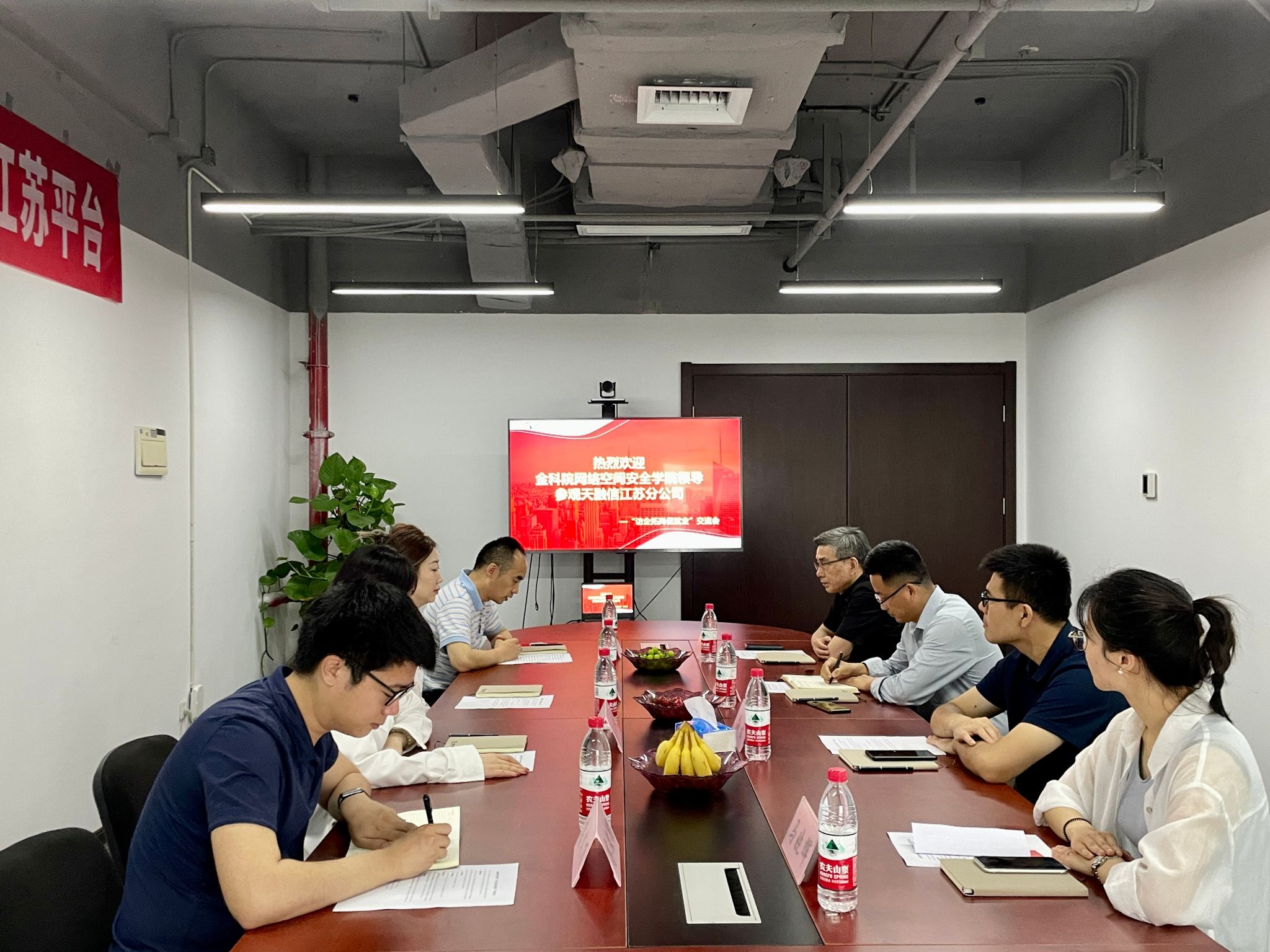 网安学院的领导和老师们首先参观了南京易科腾信息技术有限公司,紧接着走访了天融信科技集团江苏分公司。通过参观,我们深入了解了易科腾和天融信的产品技术、企业文化、公司荣誉等。参观后,双方在企业会议室进行了深入地交流座谈。两家企业的负责人对学院一行人的到来表示热烈欢迎,叶书记表明此次访企拓岗专项交流活动的目的,并介绍了学院专业特色与优势、师资队伍、人才培养、科研能力等情况。他表示希望通过访企拓岗活动能够进一步畅通学院与企业之间的联系,畅通毕业生就业渠道、拓展就业新空间、为毕业生挖掘更多岗位资源,为专业实习开拓更多岗位,最大程度保障学生充分就业、高质量就业,真正实现院企双方共赢发展。