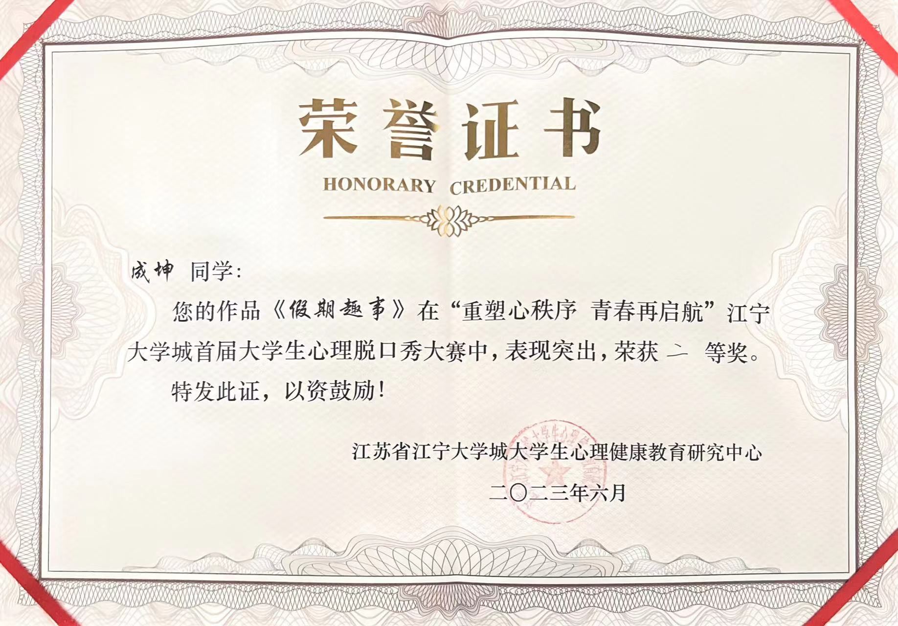 3月26日-3月29日,学院开展“重塑心秩序,青春再启航”心理摄影比赛,号召学生用镜头记录温暖瞬间、感受生命价值。4月19日,由学校心理健康中心主办、学院承办的大学生心理脱口秀比赛拉开帷幕。学生们围绕心理健康问题,自由选取角度进行脱口秀演出。6月9日,从学院大学生心理脱口秀比赛脱颖而出的电子信息工程学院22级学生成坤作为学生代表参加了“重塑心秩序,青春再启航”江宁大学城首届大学生心理脱口秀大赛。该生凭借创意主题和妙语连珠的演出取得了优异成绩,最终荣获大赛二等奖。