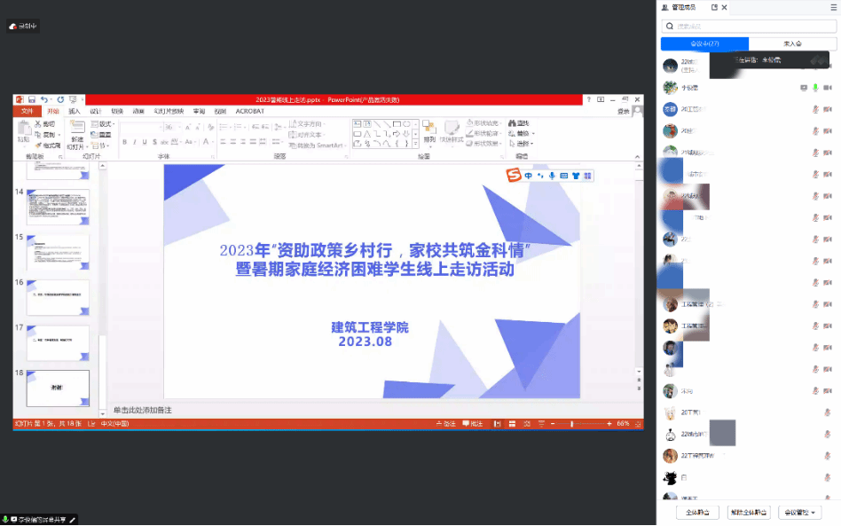 参加线上“云走访”活动学生涉及到不同年级、专业以及地区,建工学院辅导员宋向、鲁瑶、姜艳、李俊儒、濮香玉等5名老师参会,会议由李俊儒老师主持。活动过程中,资助专员宣传走访团队围绕国家资助政策及学校的人文关怀等精神资助进行宣传与分享,并与受访学生就自身家庭特点、经济状况、个人成长背景进行了交流。最后对受访学生提出了希望,一是保持积极向上的心态,保持刻苦学习的精神;二是珍惜国家的资助政策,用知识改变命运,回报父母、家庭、社会和国家,成为担当民族复兴重任的时代新人。