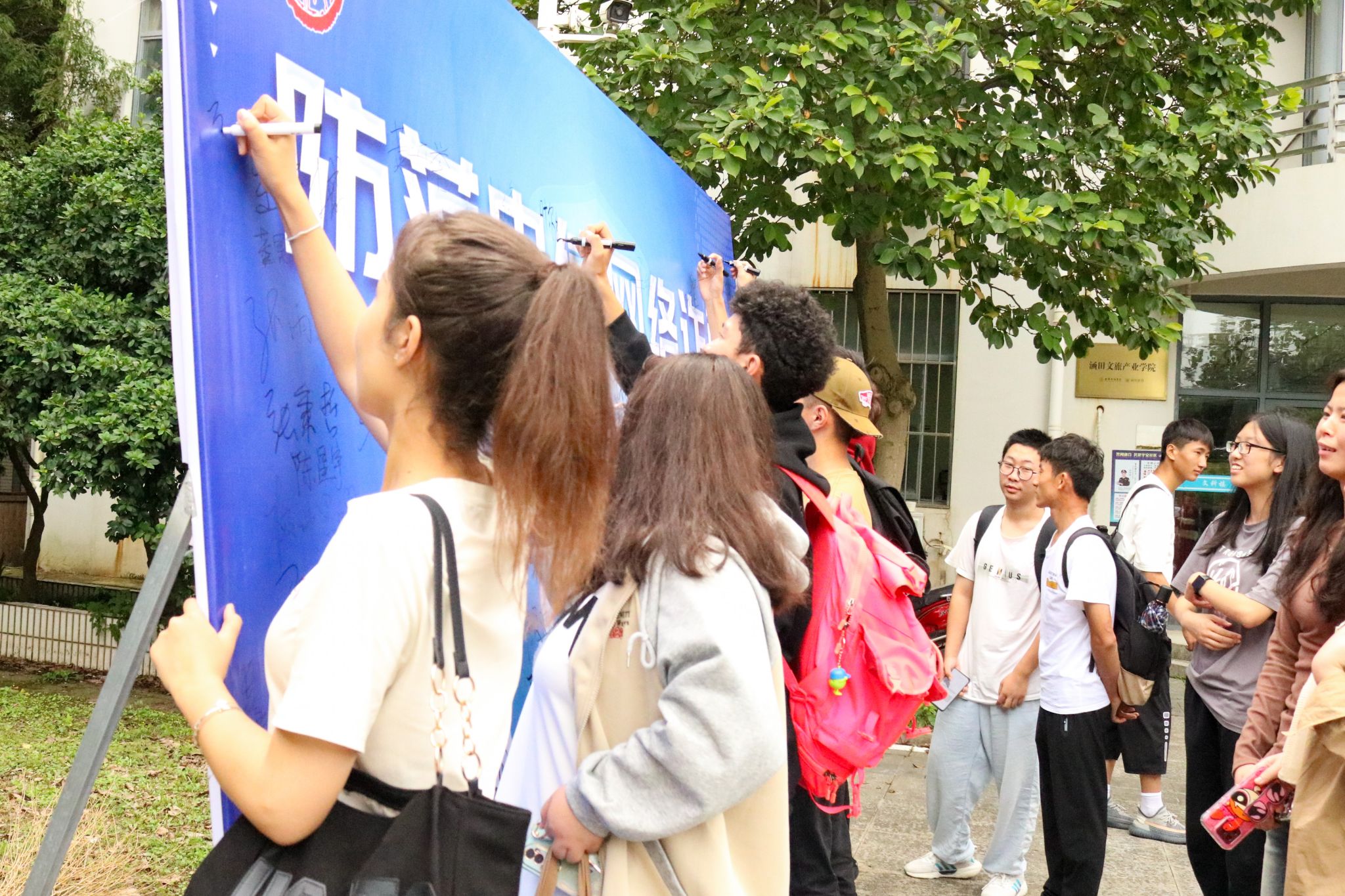 活动现场,安全工作负责辅导员张琳老师与反诈志愿者一起开展防范电信网络诈骗宣传教育,以案例讲解的形式生动传达了常见诈骗类型、特点和危害,掌握必要的防范技能,构筑坚实的思想防线。同时,学院采取展板、横幅、拍照打卡等形式,号召老师和学生在宣传展板上签名,表达对防范电信网络诈骗的决心。此外,学院充分利用QQ、微信群等线上平台向学生发送信息提醒,尤其对于新生和毕业生班级,确保将“防诈”、“反诈"内容传达到每一位学生。