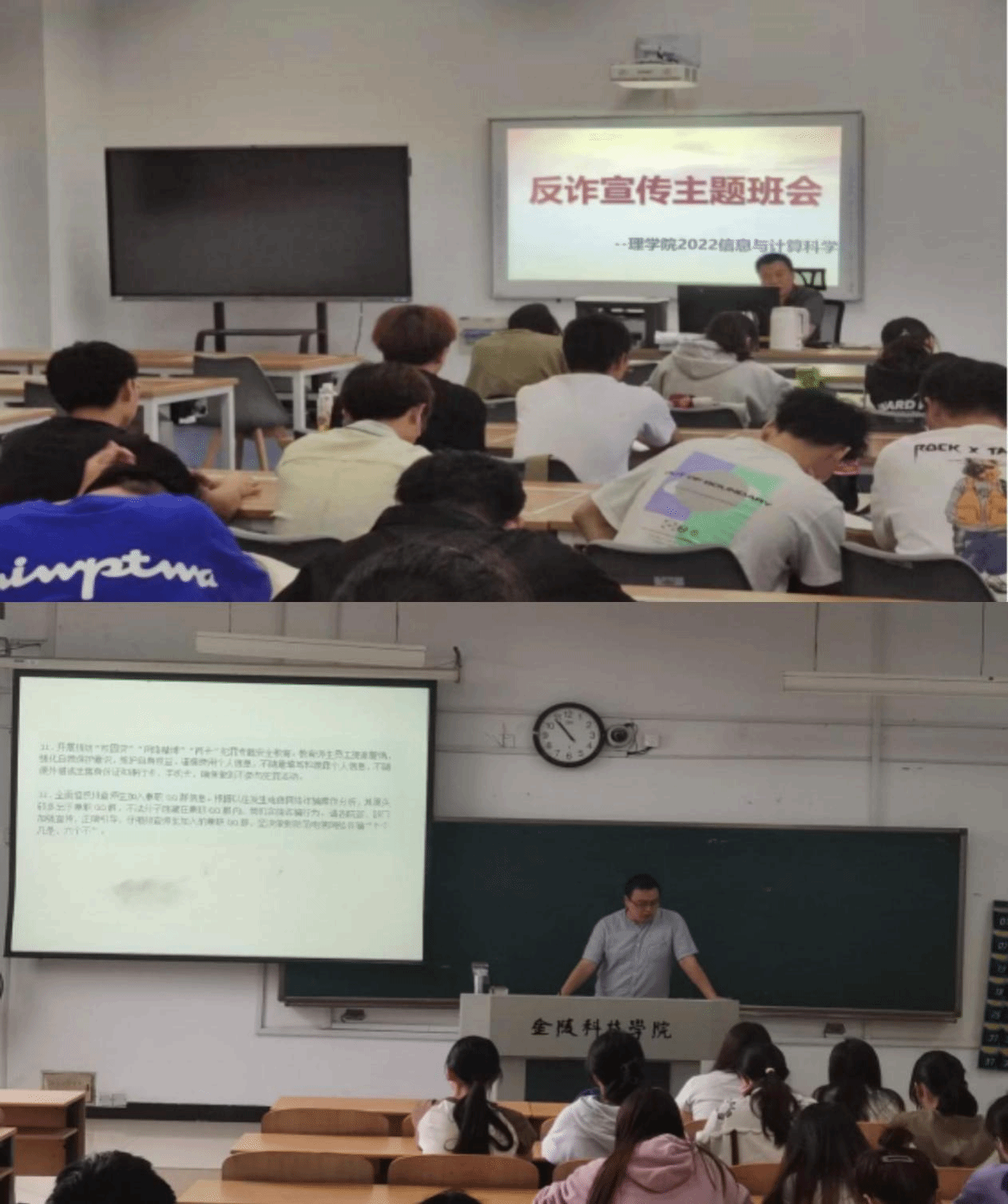 9月25日-10月12日,理学院各班开展了反诈骗主题班会,班会由各班班主任主持,全体同学参加。班会通过带领同学们学习《中华人民共和国反电信网络诈骗法》,告诫同学们要加强安全知识学习,不断提高自我保护意识和安全防范技能,同时,班会以电诈案例为主题,围绕诈骗的案例、危害和防诈措施等方面开展,结合大学生群体特点,重点介绍了刷单返利、“杀猪盘”、冒充电商物流客服等典型电信网络诈骗方式,提醒同学们要树立安全意识,注重信息安全,做好自我防护。