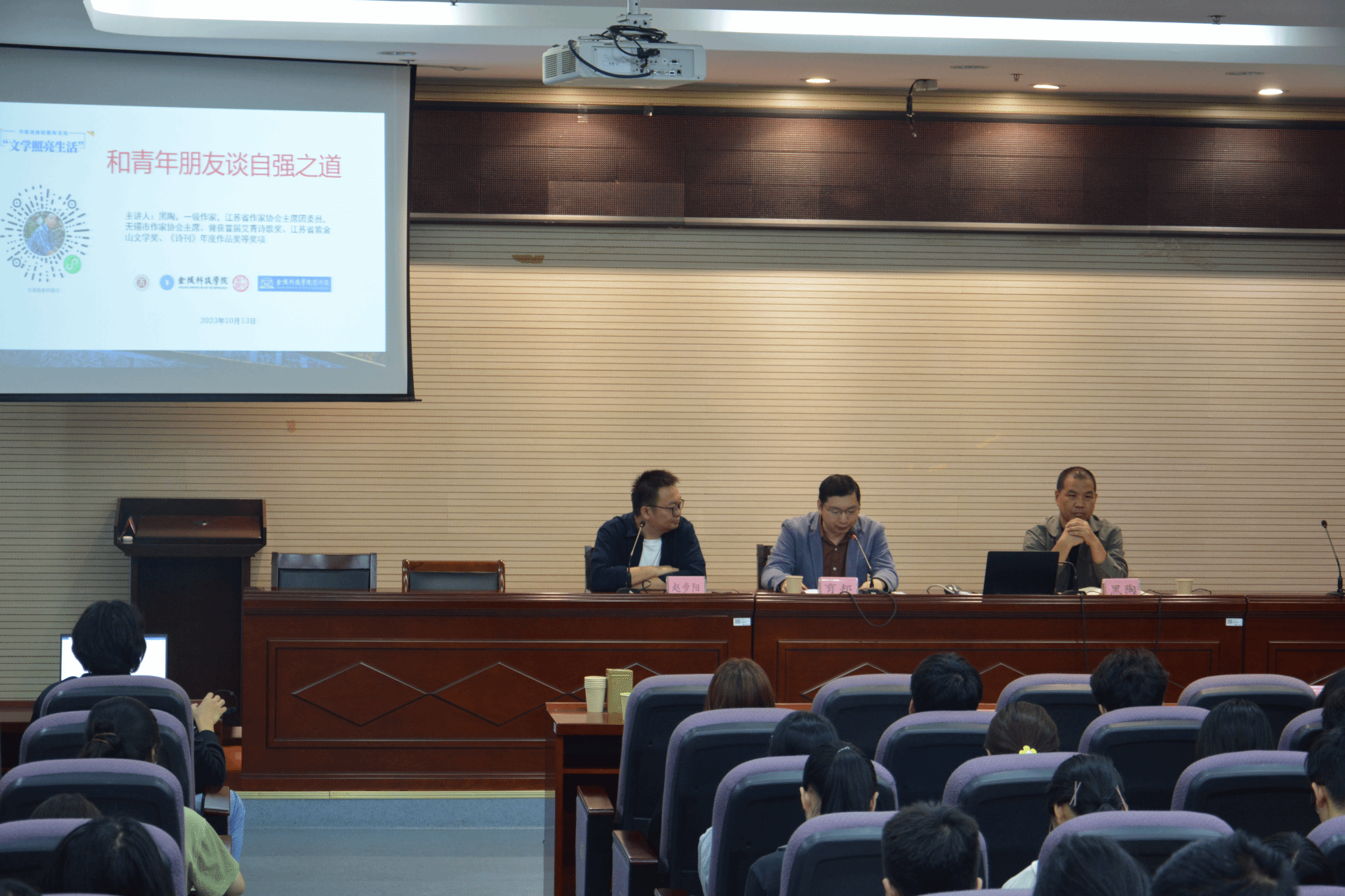 活动伊始,《雨花》杂志副主编育邦老师便详细介绍了他与黑陶老师的相识与相知,使我们得以更熟悉黑陶老师的过往。随后,黑陶老师从读书、行路、见人和做事四方面向我们细细阐述了青年自强之道。他以《夜航船》的一个笑话为切入口,指出读书能给予我们自信,并举出《百丈清规》丛林二十要则的例子,告诉我们读好书、读对书,能切实帮助我们如何在生活中为人处世。同时,黑陶老师指出,身为青年的我们不仅要脚踏实地做好自己的本职工作,也要勇敢地探索文学与世界,从而充盈自己。索尔仁尼琴说过:“我们每个人都是宇宙的中心”,黑陶老师借此提出“等视一切”的观点,并鼓励我们不要妄自菲薄,而是敢于直面人生的挑战,自强不息而勇往直前!最后,在讲座互动环节中,同学们踊跃提问,现场一问一答,气氛融洽,黑陶老师以渊博的专业知识、风趣幽默的讲解引起现场一阵阵笑声与掌声。