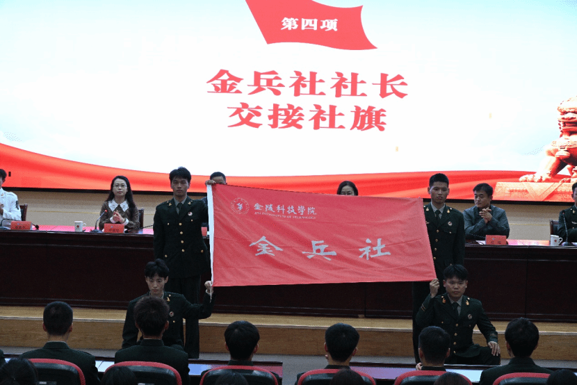 伴随着雄壮的国歌,换届大会正式开始。校党委人民武装部国防教育科科长宋标宣读金兵社新一届部长级以上人员名单;第六届社长铁顺吉总结了一年以来的工作;第七届社长曹鑫宇做了任职发言;新老两任社长交接了社旗;金兵社作训部部长徐皖苏带领新一届国旗护卫队队员进行入队宣誓。