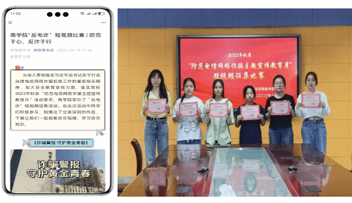 商学院通过开展防范电信网络诈骗系列宣传教育活动,不断提升学生防诈意识及识诈辨诈能力,积极传播安全文化,不断构建起“人人识诈、全民反诈”的良好氛围,努力争做“无诈学院”。(撰稿人:张才,审稿人:孙亮)
