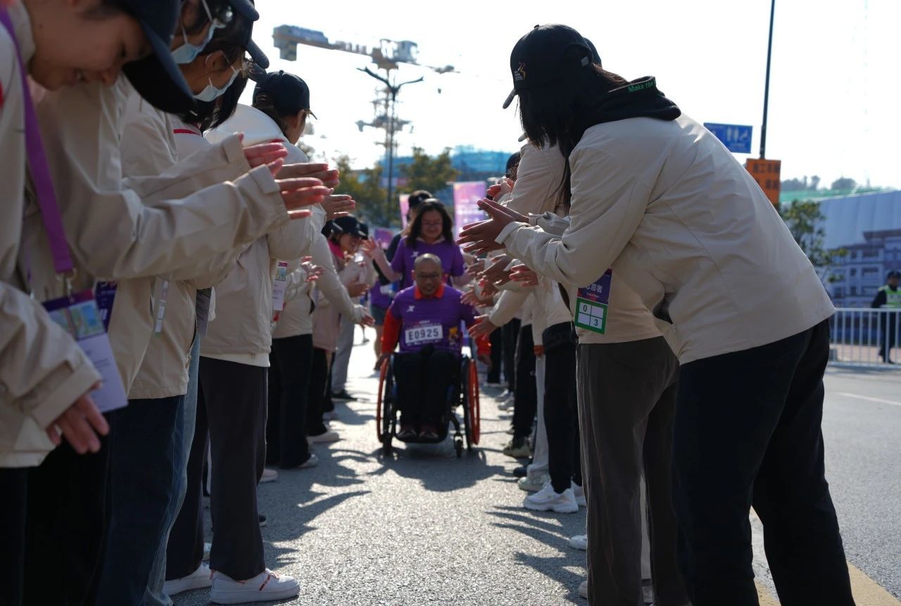 “青年如初春,如朝日,如百卉之萌动,如利刃之新发与硎,人生最可宝贵之时期也。”临近终点,志愿者们早已分排跑道两侧,准备就绪,他们洋溢着激动的笑脸,奋力鼓掌,以饱满的激情与热烈的喝彩来庆祝运动健儿们的凯旋。“恭喜完赛你最棒”,“恭喜跑完全程”,一声声温暖的祝贺,抚慰着每一位在场者的心。