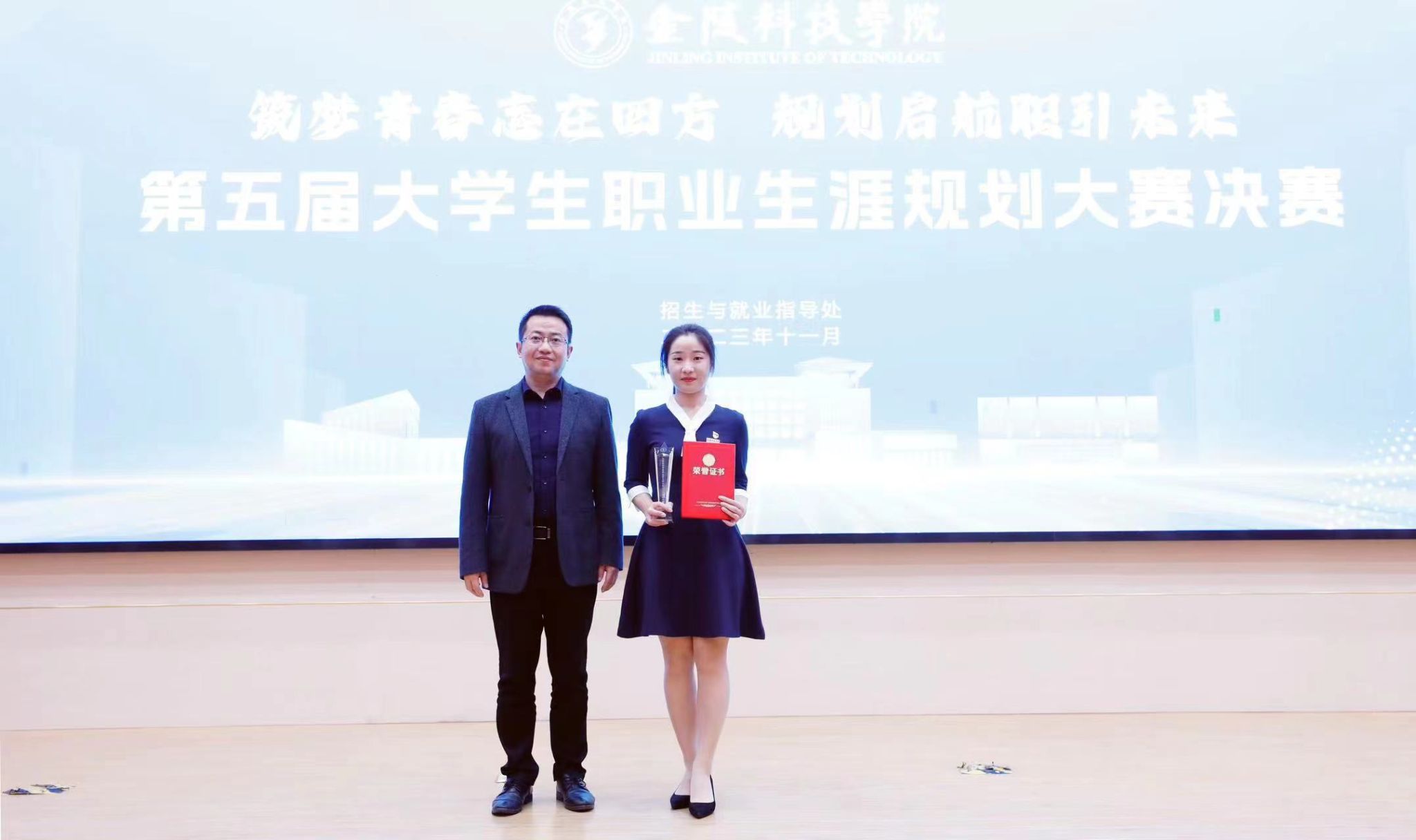 本次职业规划大赛以“筑梦青春志在四方,规划启航职引未来”为主题,以赛促教、以赛促学、以赛促宣,通过生涯认知、生涯探索、生涯准备等方面培养同学们的生涯能力,发挥出同学们的潜能与天赋。本次大赛历时5个多月,我院积极响应号召,广泛开展了年级专业班级各层面的培训、展示,通过院级初赛选拔,最终来自22旅游管理(专转本)班耿紫嫣同学一路披荆斩棘,“杀入”校赛。决赛中,耿紫嫣同学将红色讲解员作为自己的职业目标,以“赓续红色血脉,讲好中国故事”为主题,以极具感染力的陈述获得在场评委的一致好评,最终获得就业赛道一等奖的好成绩。