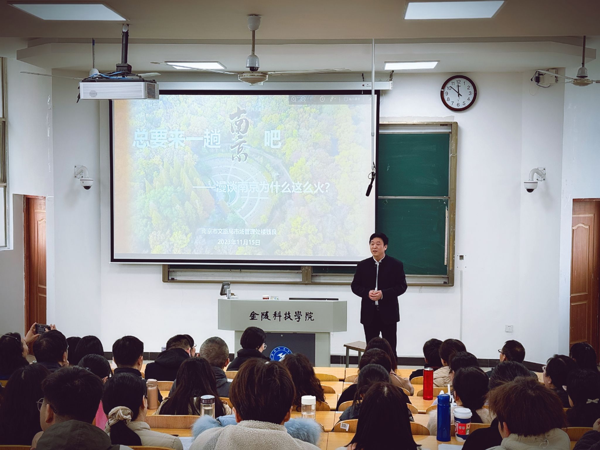 11月15日,由科技处、教师发展中心主办,外国语学院承办的第二十四期“金科学术讲堂”在江宁校区8300教室顺利开讲。本次学术课堂特邀南京市文化和旅游局市场管理处处长楼钱良以《总要来一趟南京吧——漫谈南京文旅市场为什么这么火》为题,举办专题讲座,约200名师生参加。球王会外国语学院党总支部书记李星主持讲座。