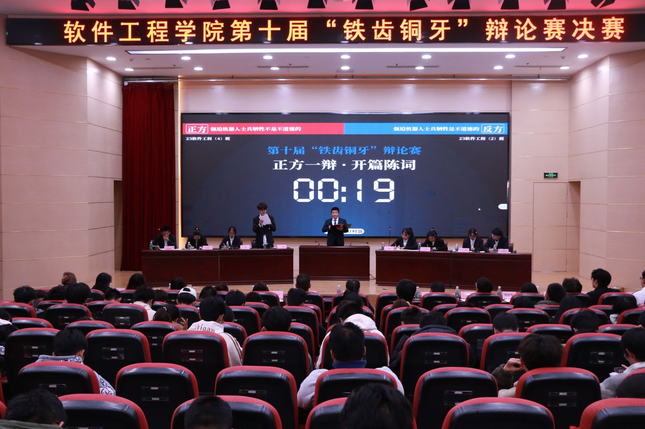 11月17日下午,软件工程学院第十届“铁齿铜牙”辩论赛决赛在科技楼一号楼报告厅如期举行,担任本次辩论赛的评委有院党委副书记徐斌、全体辅导员、校辩论队队长巩龙浩、弈言辩论社社长闫依然、学院辩论队教练张佳霖及校队主力成员阿尔山,本次辩论赛决赛选手分别是正方23级软件工程4班,反方23级软件工程2班。
