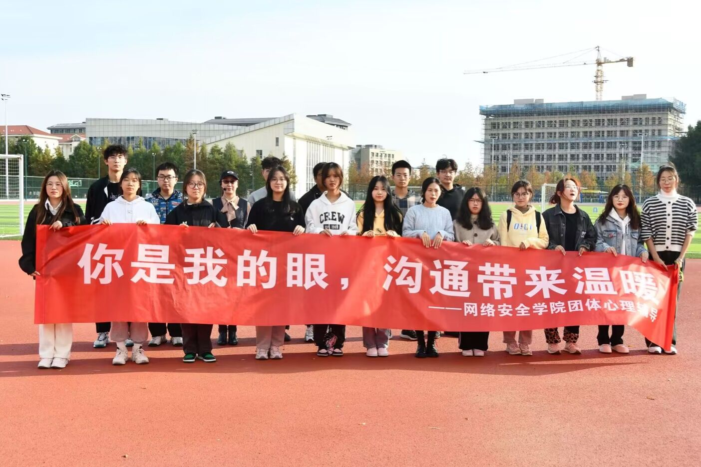 为拉近了同学们之间的距离,促进对沟通的深刻思考,网络安全学院于11月22日在南区田径场举办了"你是我的眼——沟通带来温暖"团体辅导心理活动。此次活动目的为帮助同学们培养科学的心理健康观念,形成良好的心理社会支持体系,增强对心理健康重要性的认识,使学生在自我领悟、自我反省和自我提高方面得到自我教育。