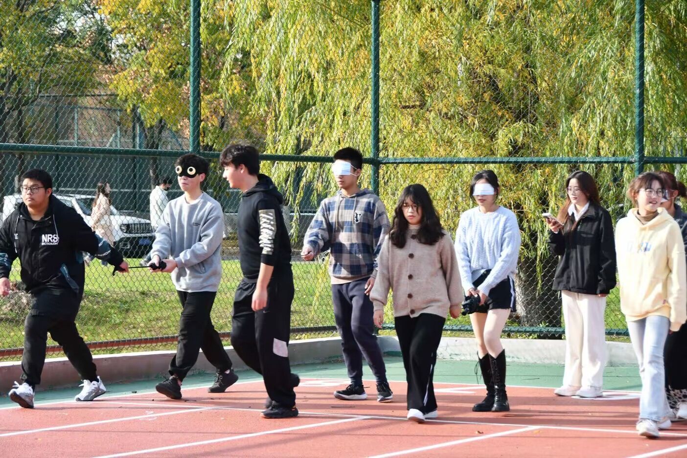 团体心理辅导吸引了广大学生的关注和参与,活动采用了一种非常特殊的方式,每两个人一组,一人蒙眼,另一人为其牵引,在校园中指定路线上进行竞走比赛。参与者需要在被蒙眼的情况下行走,依靠队友的引导来完成比赛,需要参与者充分相信队友的指引,并快速、准确地做出回应。每个队伍都经历了一系列的考验,包括如何有效地传递信息和如何听从指令等。