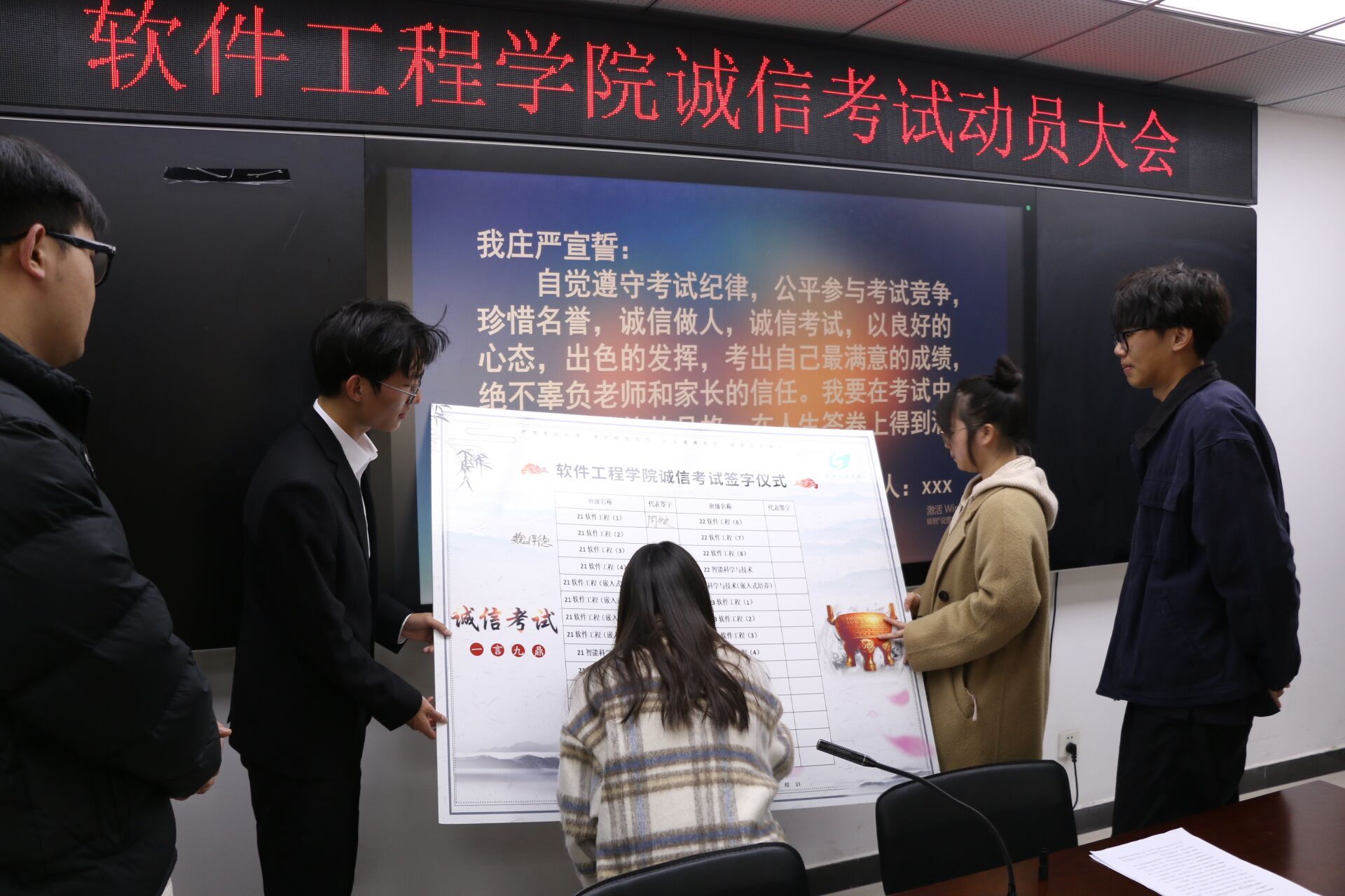 会议伊始,学习部副部长尹妍琳做学院班级学风建设情况汇报,重点强调班级风气和诚信之风在学风建设工作中的重要地位。会议中,徐斌副书记强调诚信对于个人的重要性,他教育引导各班的班长和学委要做好带头表率作用自觉遵守考试纪律,鼓励大家诚信考试。会议末尾,学习部组织现场全体与会学生代表进行了宣誓,并举行学生代表签字仪式。