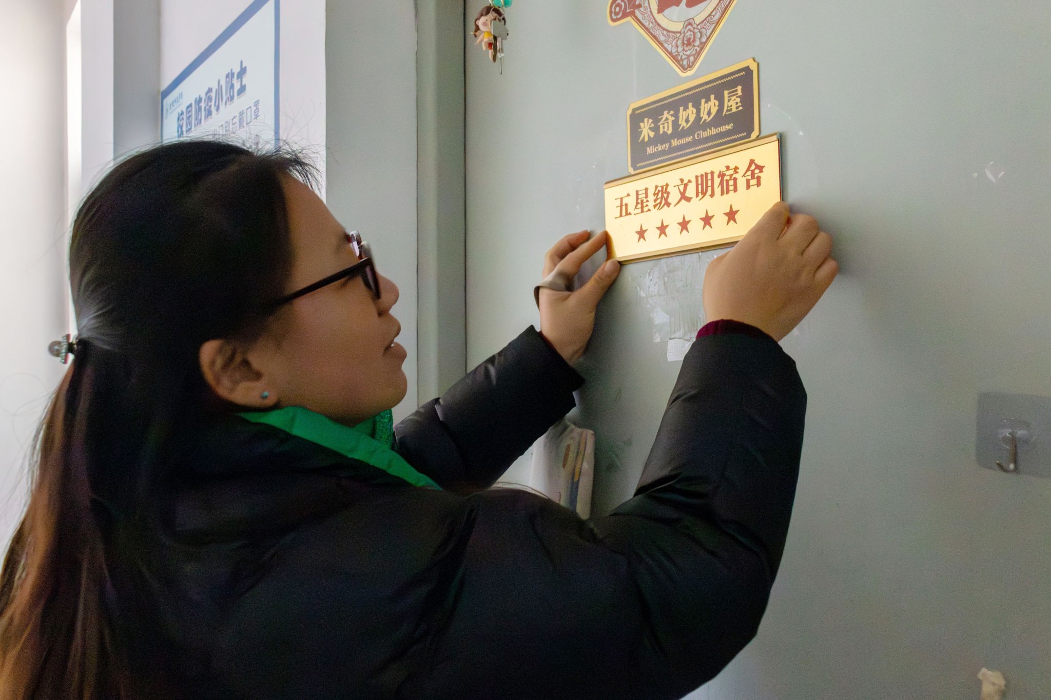 走进宿舍里,陈智慧副书记亲自为获得荣誉的宿舍进行颁牌,她表示星级宿舍是对同学们的肯定和褒奖,是大家的学习榜样。陈智慧副书记还与同学们进行了亲切地交流,鼓励同学们要继续保持良好的生活习惯和卫生习惯,注重心理健康,学会在期末备考时劳逸结合,寻找学习和休息的平衡点。辅导员赵志伟为四星级宿舍挂牌,对同学们在宿舍卫生安全、宿舍文化建设方面取得的成果表示了充分的肯定。获奖宿舍同学纷纷表示会倍加珍惜这份荣誉,为营造良好的宿舍环境做出更多的努力。