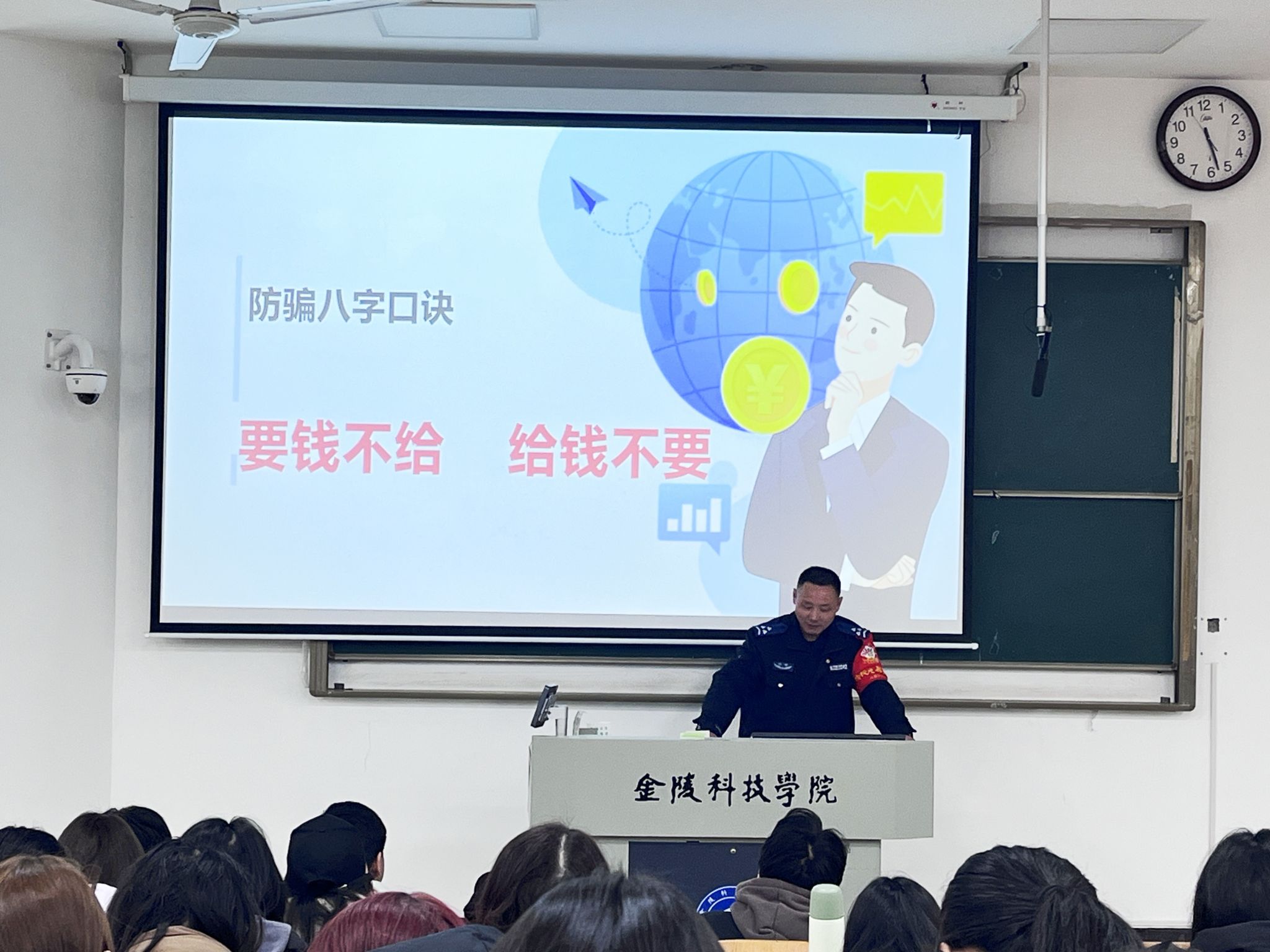宣讲会上,张警官围绕“五大诈骗类型”以案释法,向学生们详细讲述了电信诈骗的特点、作案手法、危害以及预防措施。他叮嘱同学们要不断强化防骗意识,切忌贪小便宜,一旦被骗,要保留自己已掌握的证据并及时报警,切实维护好自身的合法权益。最后,张警官为学生们总结了防骗八字口诀“要钱不给,给钱不要”,用生动幽默的语言让学生听得懂,记得牢。