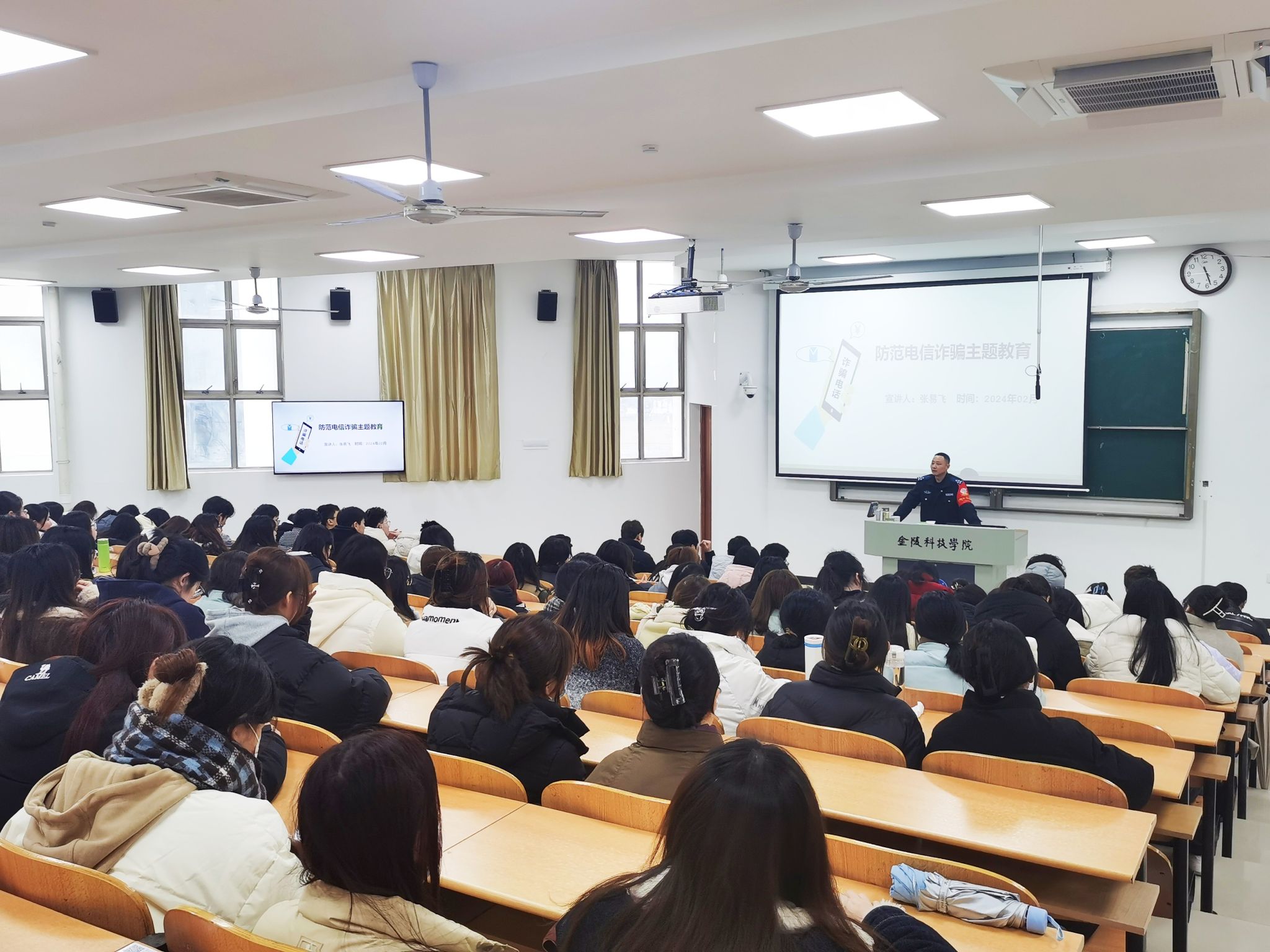 为有效遏制校园电信网络诈骗高发态势,进一步增强学生对电信诈骗的防范意识,营造平安和谐的校园环境,2月28日、29日下午,外国语学院邀请高新区民警张易飞来校,举办了两场 “反电诈”知识专题宣讲会,用鲜活的案例为学生敲响警钟,校警同心,共筑校园“反诈墙”。