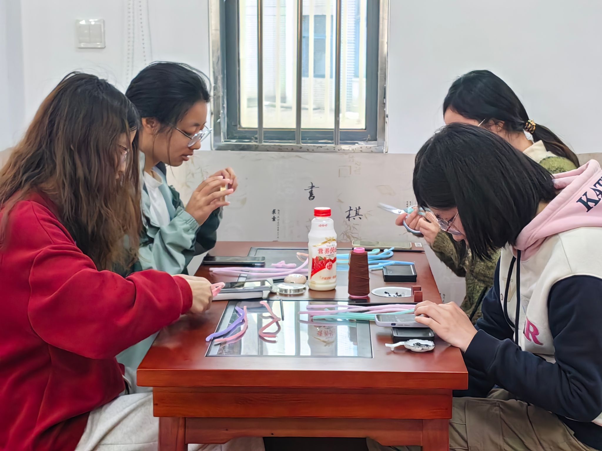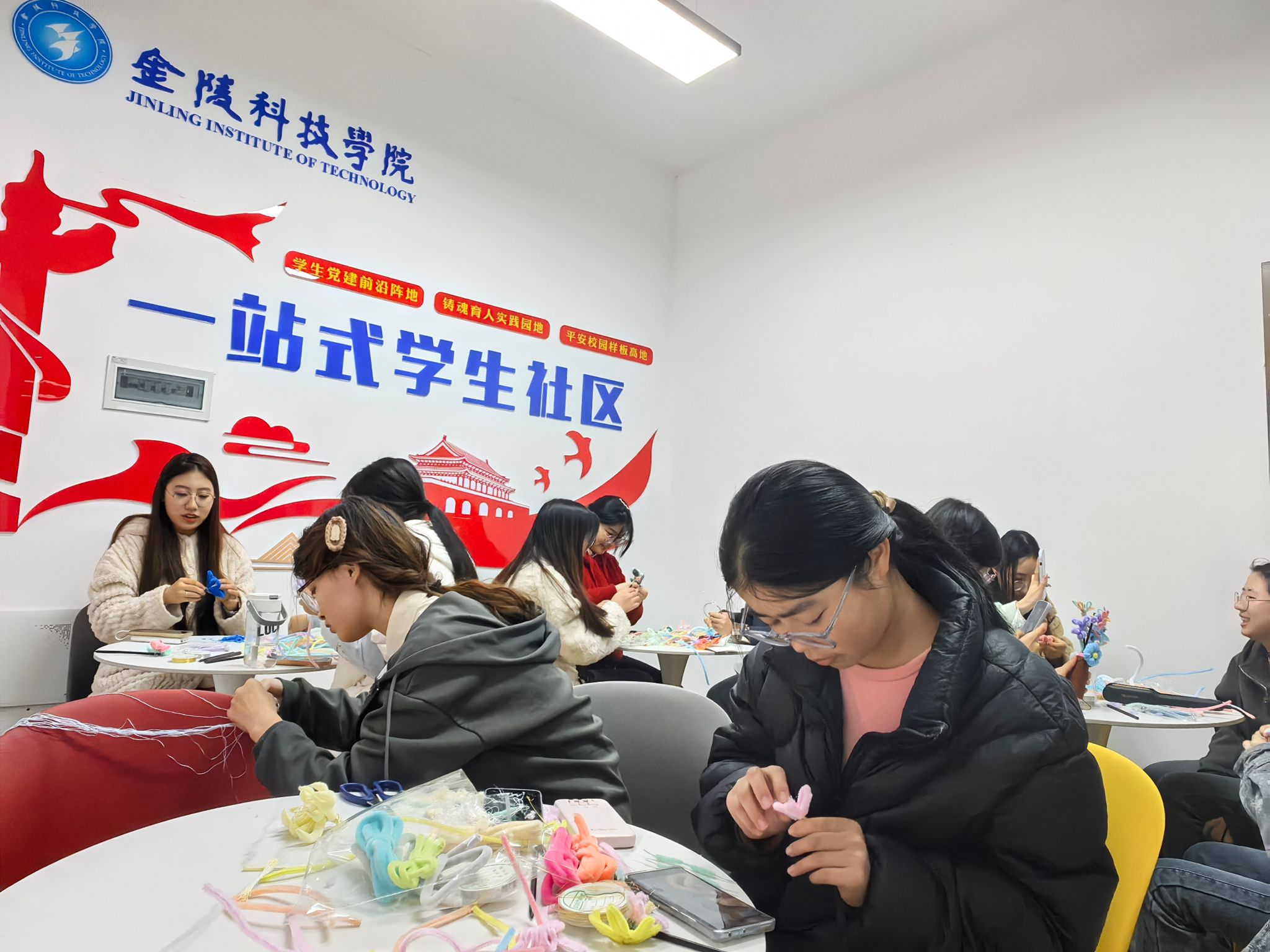 在活动筹备中,在幕府校区学生一站式服务社区,第一批报名的“手工艺人”率先开展绒花制作预热,为正式活动的举办开了个好头。活动当天,在国学社同学的精彩讲解下,大家深入了解了绒花的起源、发展历程及制作技艺,对绒花这一非遗文化有了更深刻的认识。随后,同学们纷纷投入创作,他们挑选绒线、搭配色彩,首先使用剪刀对绒条进行加工,使其变成锥形、弧形等形状,以便于之后组合成花叶。大家接着按照自己的喜好制作不同颜色的花朵,通过绒条颜色的搭配和花瓣层次的整理,将各式花朵形态呈现出来。
