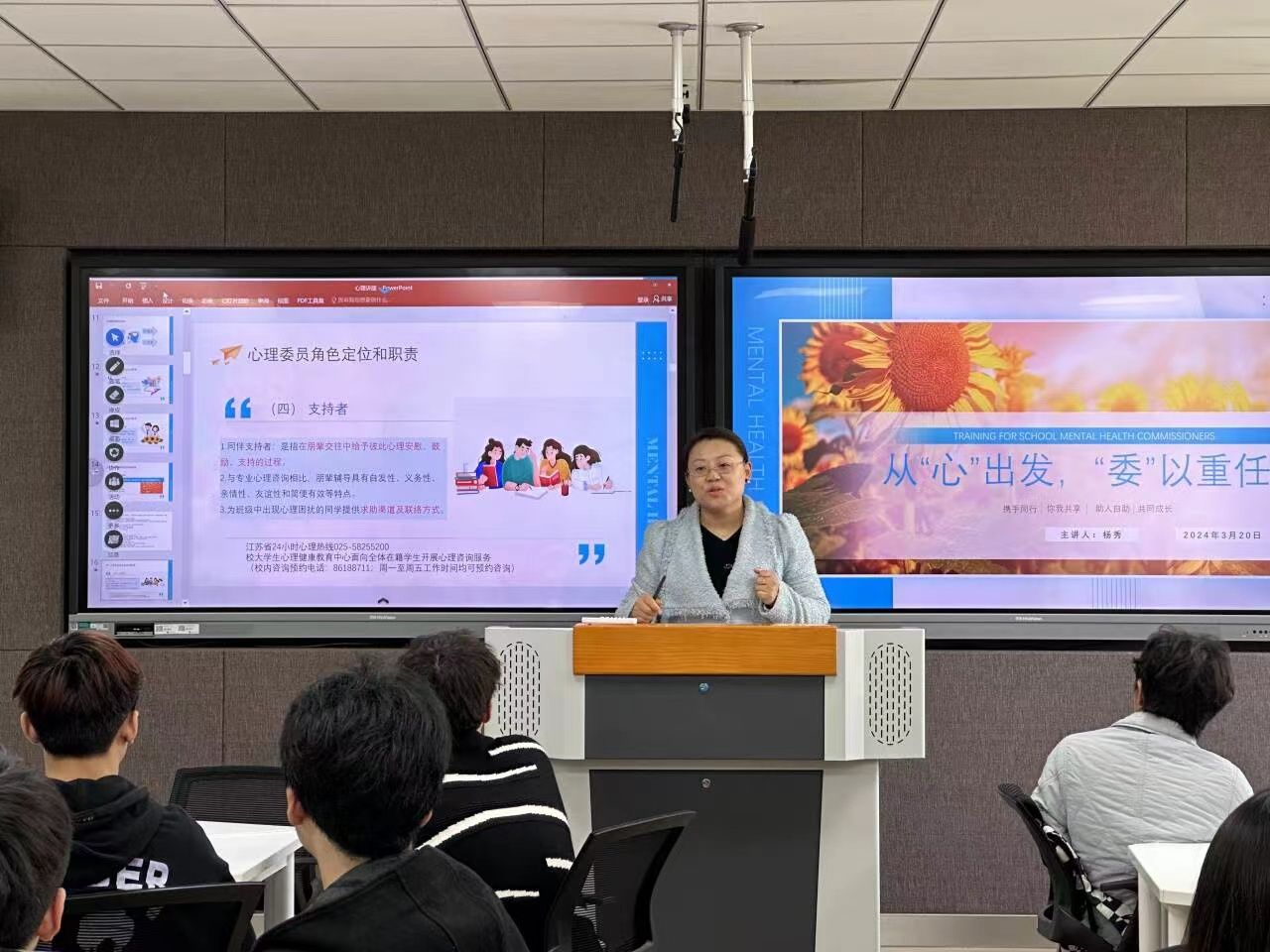 为进一步提升我院心理委员朋辈助人、危机识别等能力,深入开展“3.20心理健康教育周”活动,3月20日,机电工程学院在工科楼C514开展了一场主题为“从心出发,委以重任”的主题心理讲座,院党委副书记张蓉出席,由国家二级心理咨询师、辅导员杨秀老师主讲,全体心理委员、心理协会成员参加。