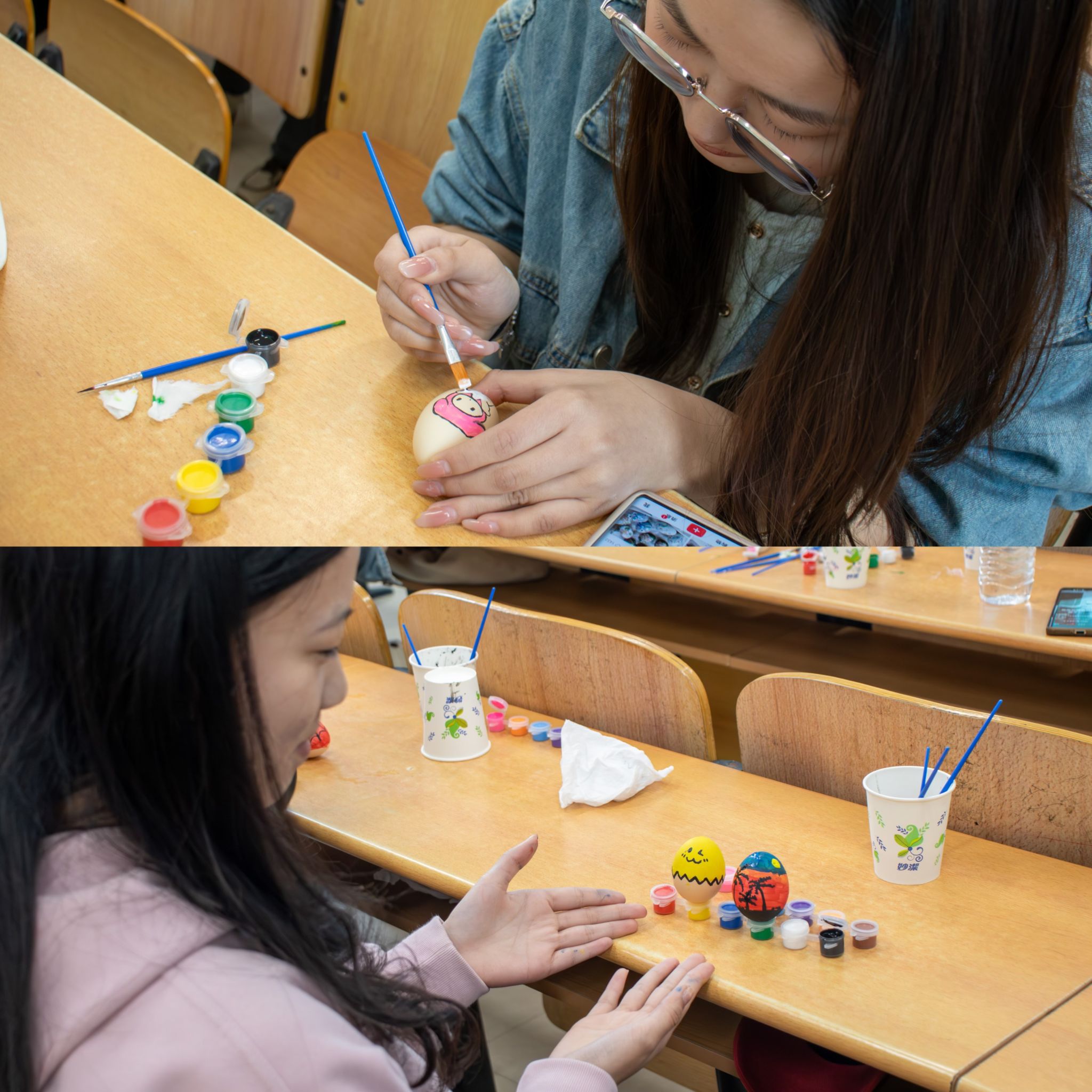 活动伊始,同学们便纷纷动手尝试立蛋,他们或调整鸡蛋的摆放角度,或利用桌面的微小不平来寻找平衡点。经过一番努力,许多同学成功地将鸡蛋稳稳地立在了桌面上,喜悦之情溢于言表。立蛋成功后,同学们拿起画笔,在鸡蛋上描绘出各种图案。有的画出了春天的花朵,有的画出了可爱的小动物,还有的同学将鸡蛋装饰成了五彩斑斓的艺术品,大家充分发挥了动手能力和想象力,将普通的鸡蛋变成了充满个性的作品。最终,19件作品脱颖而出,这不仅展示了同学们的绘画才华,更体现了他们对传统文化的热爱与传承。