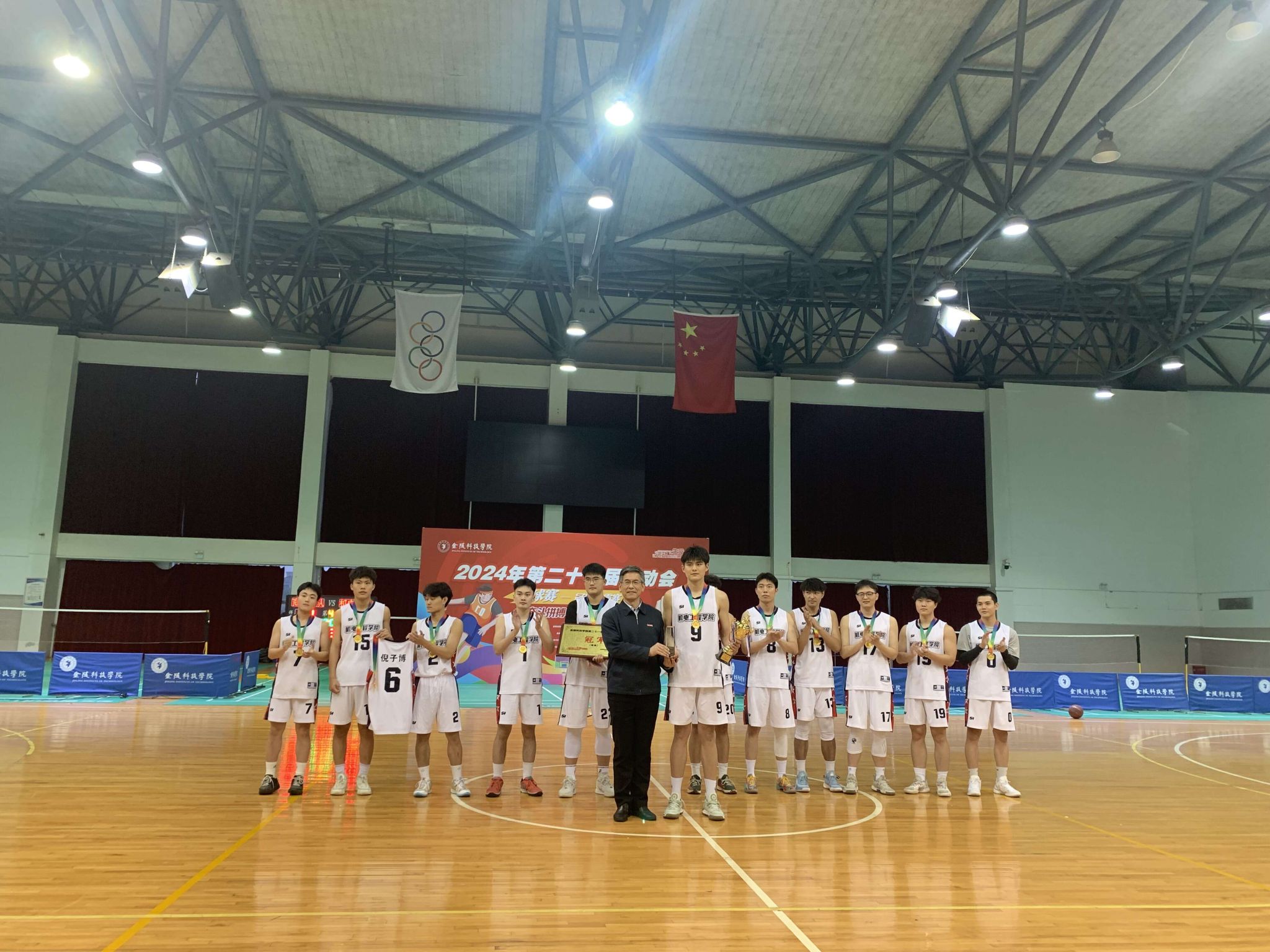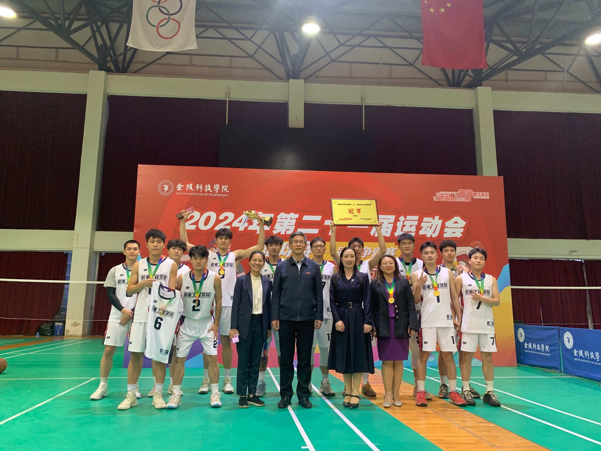 4月17日,校第二十一届运动会篮球比赛决赛在江宁校区体育馆落下帷幕,经过激烈角逐,最终机电工程学院战胜商学院,斩获全校篮球比赛决赛男子组冠军!我院22级智能制造工程的黄泳镜同学荣获“全场最佳球员”。